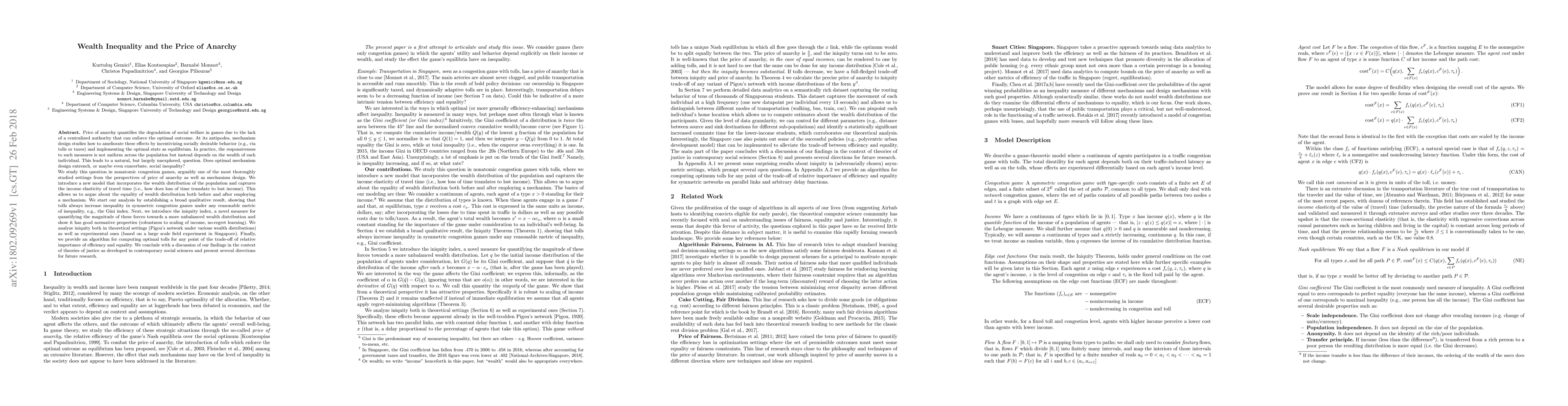 Price of anarchy quantifies the degradation of social welfare in games due to the lack of a centralized authority that can enforce the optimal outcome. At its antipodes, mechanism design studies how to ameliorate these effects by incentivizing socially desirable behavior and implementing the optimal state as equilibrium. In practice, the responsiveness to such measures depends on the wealth of each individual. This leads to a natural, but largely unexplored, question. Does optimal mechanism design entrench, or maybe even exacerbate, social inequality? We study this question in nonatomic congestion games, arguably one of the most thoroughly studied settings from the perspectives of price of anarchy as well as mechanism design. We introduce a new model that incorporates the wealth distribution of the population and captures the income elasticity of travel time. This allows us to argue about the equality of wealth distribution both before and after employing a mechanism. We start our analysis by establishing a broad qualitative result, showing that tolls always increase inequality in symmetric congestion games under any reasonable metric of inequality, e.g., the Gini index. Next, we introduce the iniquity index, a novel measure for quantifying the magnitude of these forces towards a more unbalanced wealth distribution and show it has good normative properties (robustness to scaling of income, no-regret learning). We analyze iniquity both in theoretical settings (Pigou's network under various wealth distributions) as well as experimental ones (based on a large scale field experiment in Singapore). Finally, we provide an algorithm for computing optimal tolls for any point of the trade-off of relative importance of efficiency and equality. We conclude with a discussion of our findings in the context of theories of justice as developed in contemporary social sciences.