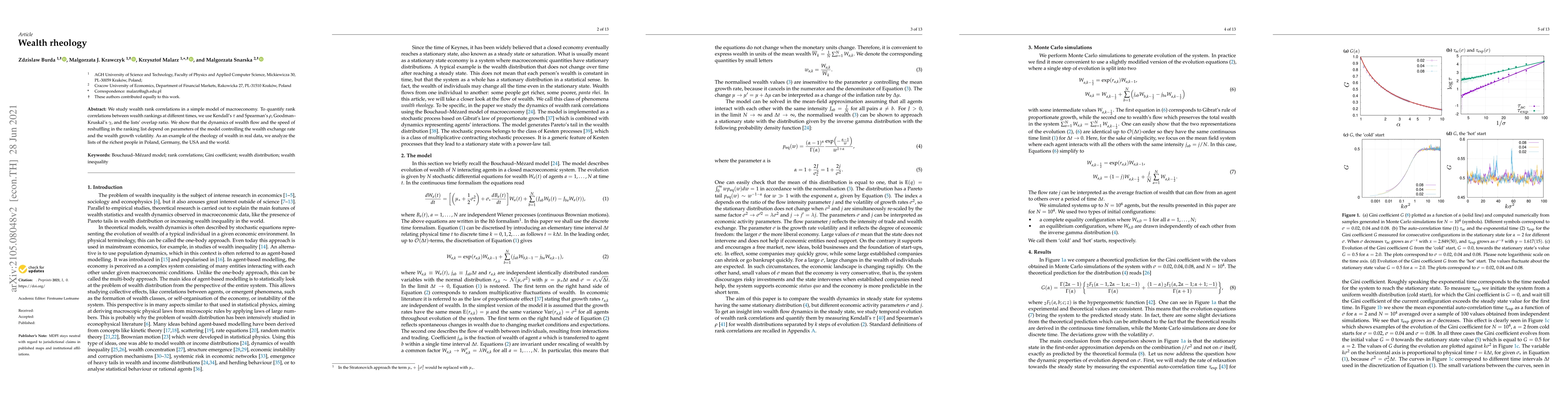 We study wealth rank correlations in a simple model of macro-economy. To quantify rank correlations between wealth rankings at different times, we use Kendall's $\tau$ and Spearman's $\rho$, Goodman--Kruskal's $\gamma$, and the lists' overlap ratio. We show that the dynamics of wealth flow and the speed of reshuffling in the ranking list depend on parameters of the model controlling the wealth exchange rate and the wealth growth volatility. As an example of the rheology of wealth in real data, we analyze the lists of the richest people in Poland, Germany, the USA and the world.