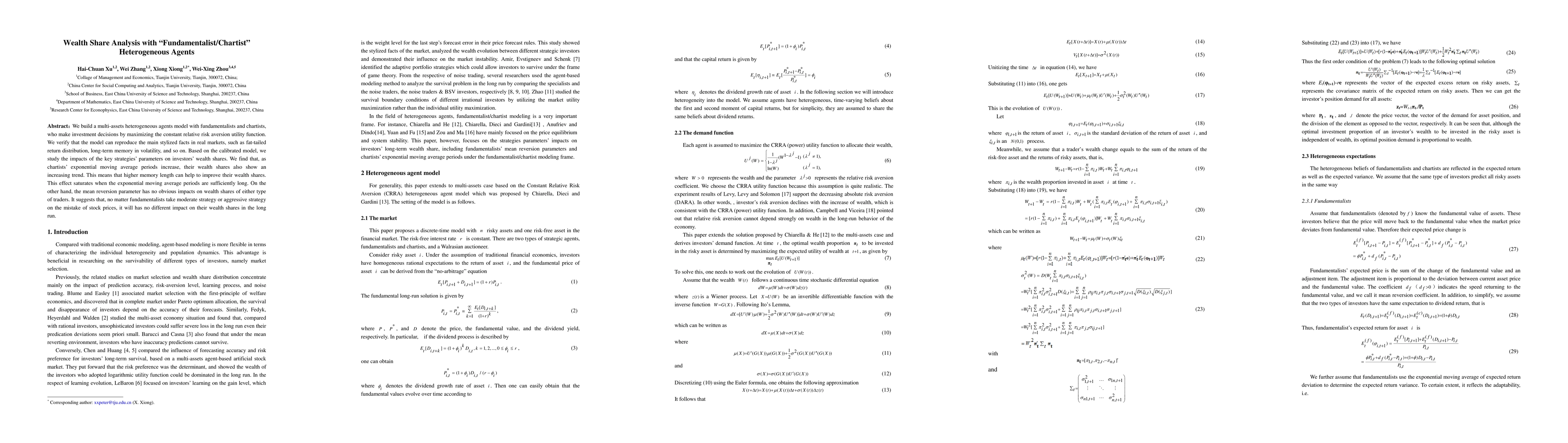 We build a multiassets heterogeneous agents model with fundamentalists and chartists, who make investment decisions by maximizing the constant relative risk aversion utility function. We verify that the model can reproduce the main stylized facts in real markets, such as fat-tailed return distribution and long-term memory in volatility. Based on the calibrated model, we study the impacts of the key strategies' parameters on investors' wealth shares. We find that, as chartists' exponential moving average periods increase, their wealth shares also show an increasing trend. This means that higher memory length can help to improve their wealth shares. This effect saturates when the exponential moving average periods are sufficiently long. On the other hand, the mean reversion parameter has no obvious impacts on wealth shares of either type of traders. It suggests that no matter whether fundamentalists take moderate strategy or aggressive strategy on the mistake of stock prices, it will have no different impact on their wealth shares in the long run.