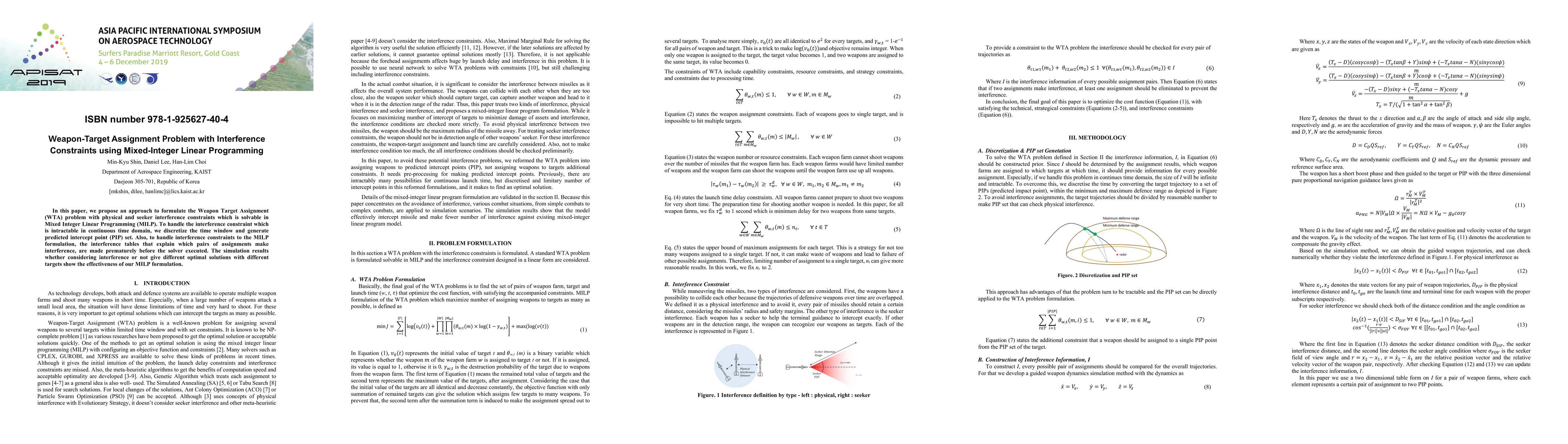 In this paper, we propose an approach to formulate the Weapon Target Assignment (WTA) problem with physical and seeker interference constraints which is solvable in Mixed Integer Linear Programming (MILP). To handle the interference constraint which is intractable in continuous time domain, we discretize the time window and generate predicted intercept point (PIP) set. Also, to handle interference constraints to the MILP formulation, the interference tables that explain which pairs of assignments make interference, are made prematurely before the solver executed. The simulation results whether considering interference or not give different optimal solutions with different targets show the effectiveness of our MILP formulation.