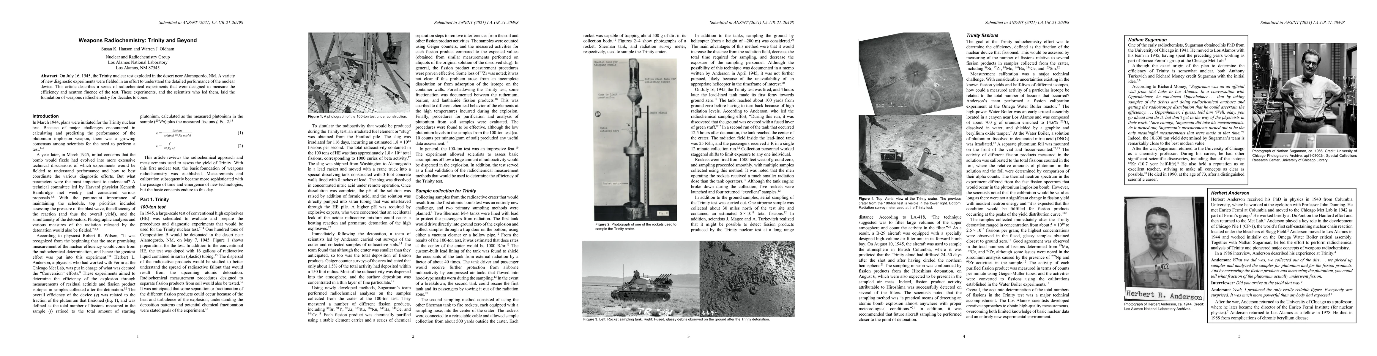 On July 16, 1945, the Trinity nuclear test exploded in the desert near Alamogordo, NM. A variety of new diagnostic experiments were fielded in an effort to understand the detailed performance of the nuclear device. This article describes a series of radiochemical experiments that were designed to measure the efficiency and neutron fluence of the test. These experiments, and the scientists who led them, laid the foundation of weapons radiochemistry for decades to come.