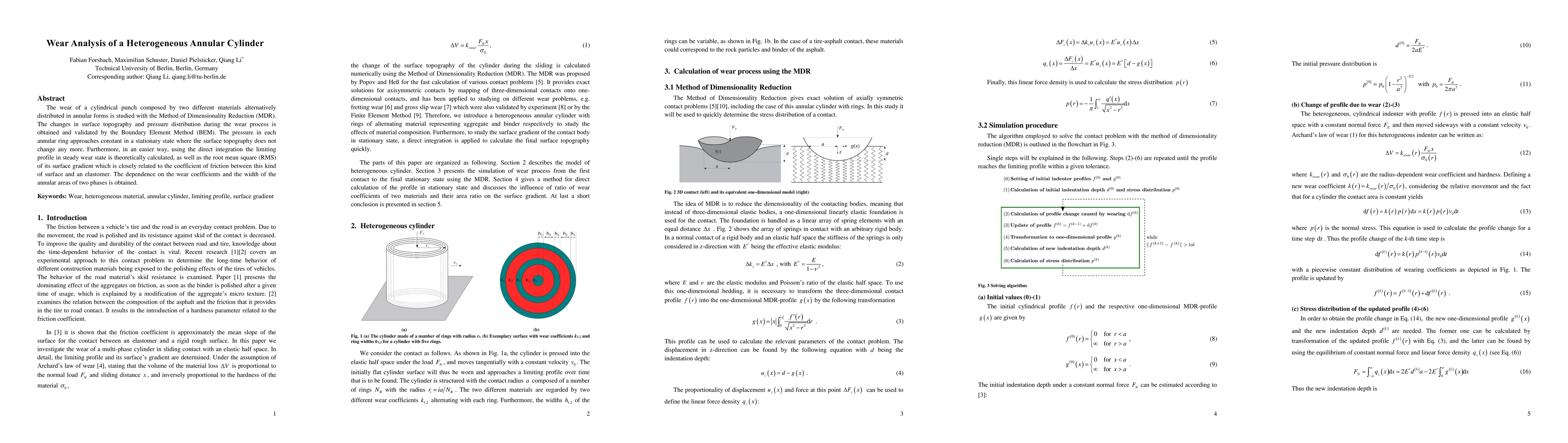 This paper investigates the wear behavior of a cylindrical punch made from two alternating annular materials using the Method of Dimensionality Reduction (MDR). It analyzes surface topography and pressure distribution changes, validated by the Boundary Element Method (BEM), and calculates the steady wear state profile and RMS surface gradient, relating it to friction coefficients.