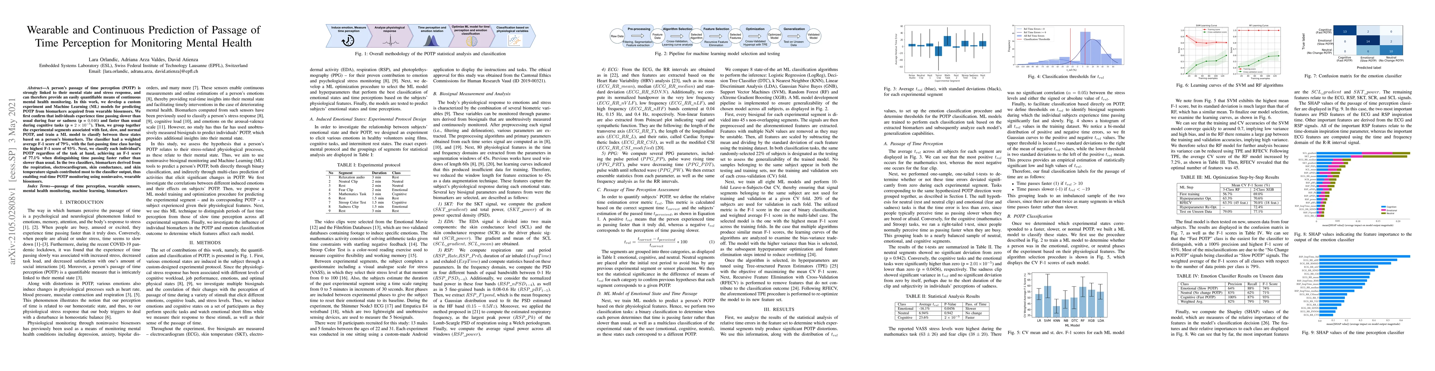 A person's passage of time perception (POTP) is strongly linked to their mental state and stress response, and can therefore provide an easily quantifiable means of continuous mental health monitoring. In this work, we develop a custom experiment and Machine Learning (ML) models for predicting POTP from biomarkers acquired from wearable biosensors. We first confirm that individuals experience time passing slower than usual during fear or sadness (p = 0.046) and faster than usual during cognitive tasks (p = 2 x 10^-5). Then, we group together the experimental segments associated with fast, slow, and normal POTP, and train a ML model to classify between these states based on a person's biomarkers. The classifier had a weighted average F-1 score of 79%, with the fast-passing time class having the highest F-1 score of 93%. Next, we classify each individual's POTP regardless of the task at hand, achieving an F-1 score of 77.1% when distinguishing time passing faster rather than slower than usual. In the two classifiers, biomarkers derived from the respiration, electrocardiogram, skin conductance, and skin temperature signals contributed most to the classifier output, thus enabling real-time POTP monitoring using noninvasive, wearable biosensors.