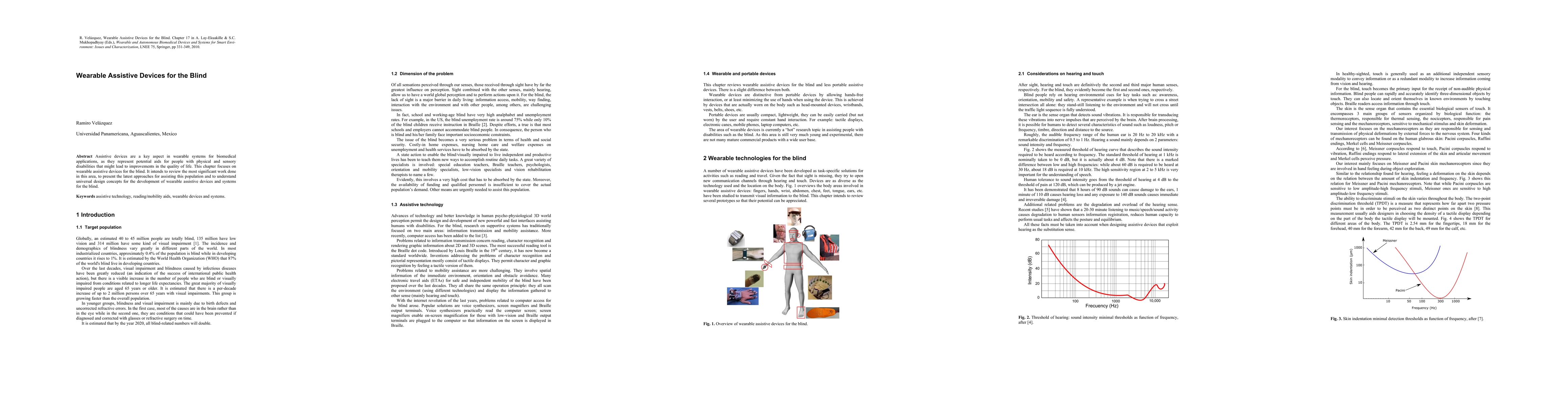 Assistive devices are a key aspect in wearable systems for biomedical applications, as they represent potential aids for people with physical and sensory disabilities that might lead to improvements in the quality of life. This chapter focuses on wearable assistive devices for the blind. It intends to review the most significant work done in this area, to present the latest approaches for assisting this population and to understand universal design concepts for the development of wearable assistive devices and systems for the blind.