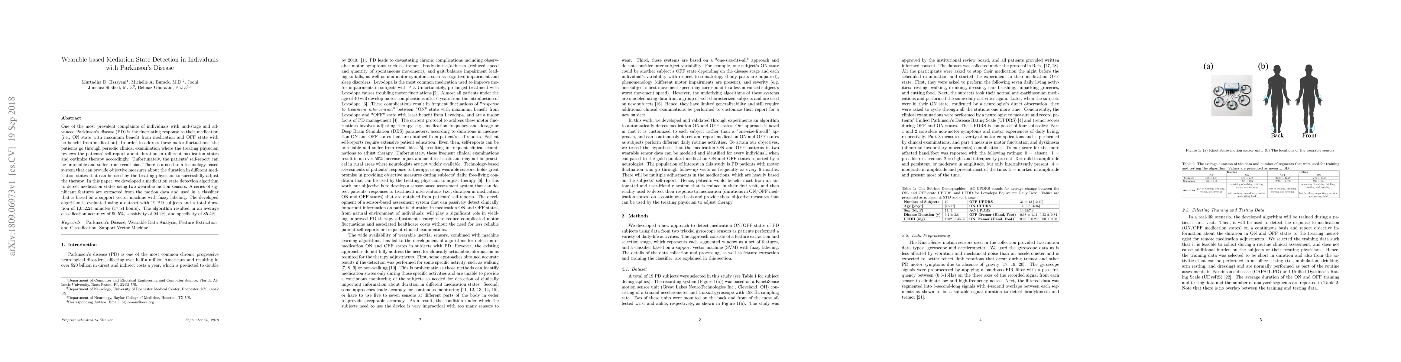 This paper presents a wearable-based algorithm using motion sensors to objectively detect medication states in Parkinson's disease patients, achieving 90.5% accuracy, 94.2% sensitivity, and 85.4% specificity, aiming to improve therapy optimization over unreliable self-reports.