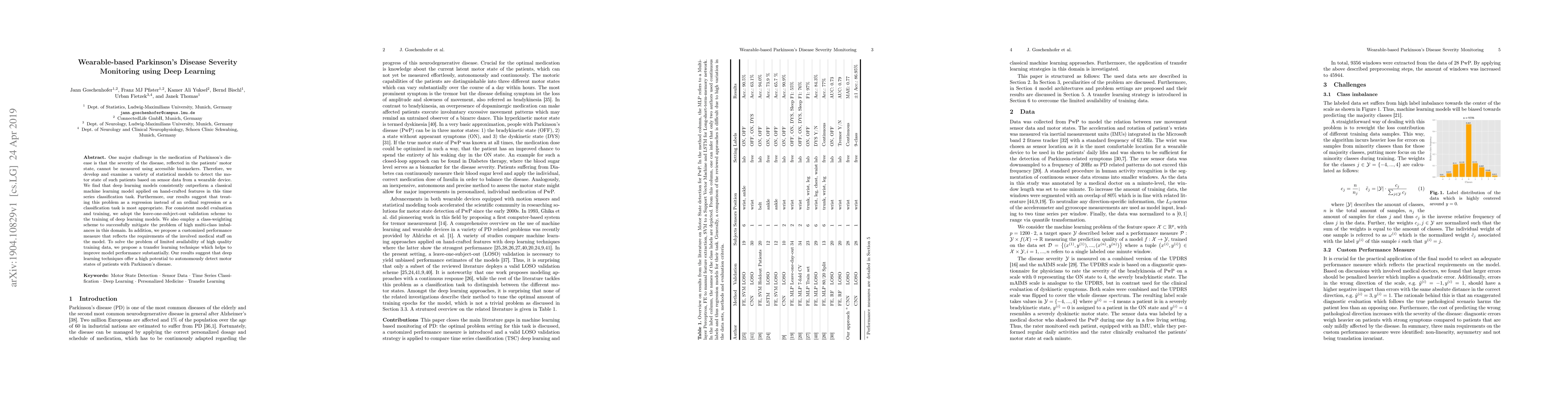One major challenge in the medication of Parkinson's disease is that the severity of the disease, reflected in the patients' motor state, cannot be measured using accessible biomarkers. Therefore, we develop and examine a variety of statistical models to detect the motor state of such patients based on sensor data from a wearable device. We find that deep learning models consistently outperform a classical machine learning model applied on hand-crafted features in this time series classification task. Furthermore, our results suggest that treating this problem as a regression instead of an ordinal regression or a classification task is most appropriate. For consistent model evaluation and training, we adopt the leave-one-subject-out validation scheme to the training of deep learning models. We also employ a class-weighting scheme to successfully mitigate the problem of high multi-class imbalances in this domain. In addition, we propose a customized performance measure that reflects the requirements of the involved medical staff on the model. To solve the problem of limited availability of high quality training data, we propose a transfer learning technique which helps to improve model performance substantially. Our results suggest that deep learning techniques offer a high potential to autonomously detect motor states of patients with Parkinson's disease.