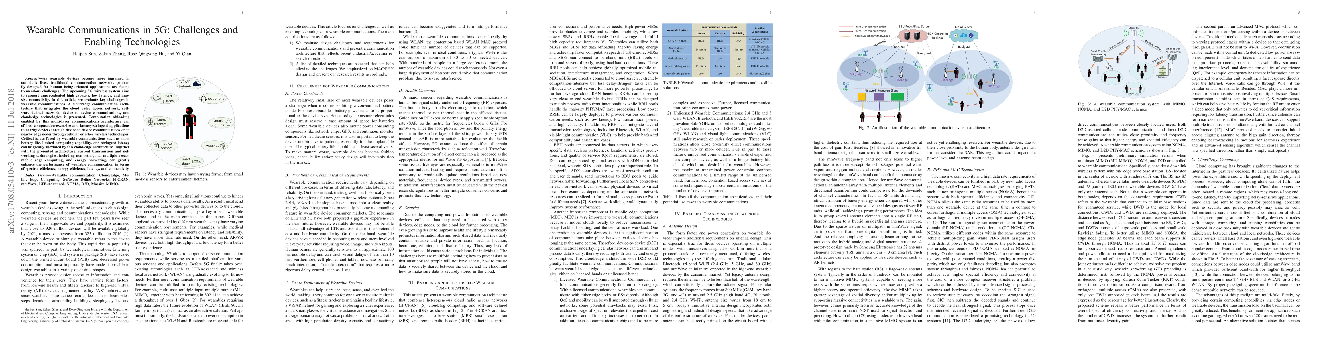 This paper evaluates challenges in wearable communications, emphasizing short battery life, limited computing power, and stringent latency. It proposes a cloud/edge communication architecture to address these issues, leveraging technologies like non-orthogonal multiple access, mobile edge computing, and energy harvesting to enhance performance.
