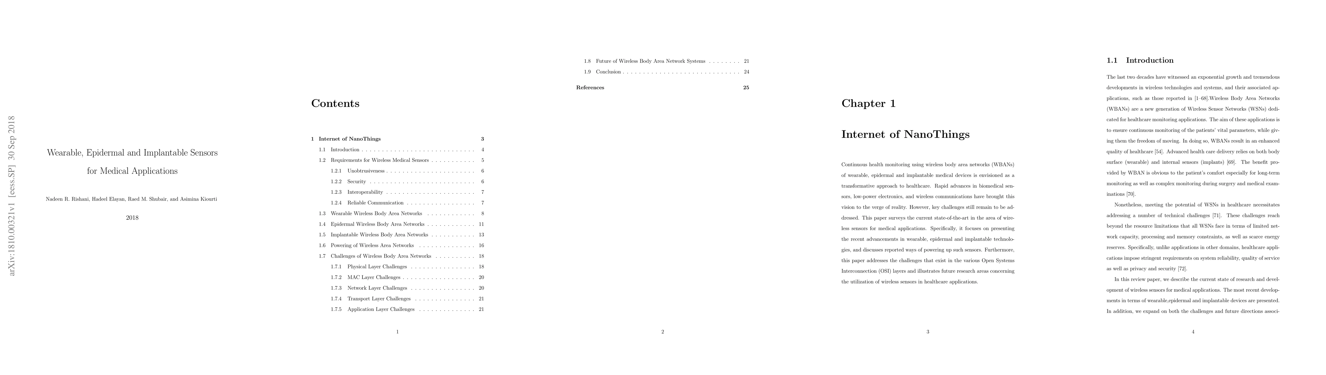 This paper surveys advancements in wearable, epidermal, and implantable wireless sensors for medical applications, highlighting recent technologies and power solutions. It also addresses challenges across the OSI layers and outlines future research directions for integrating these sensors into healthcare.
