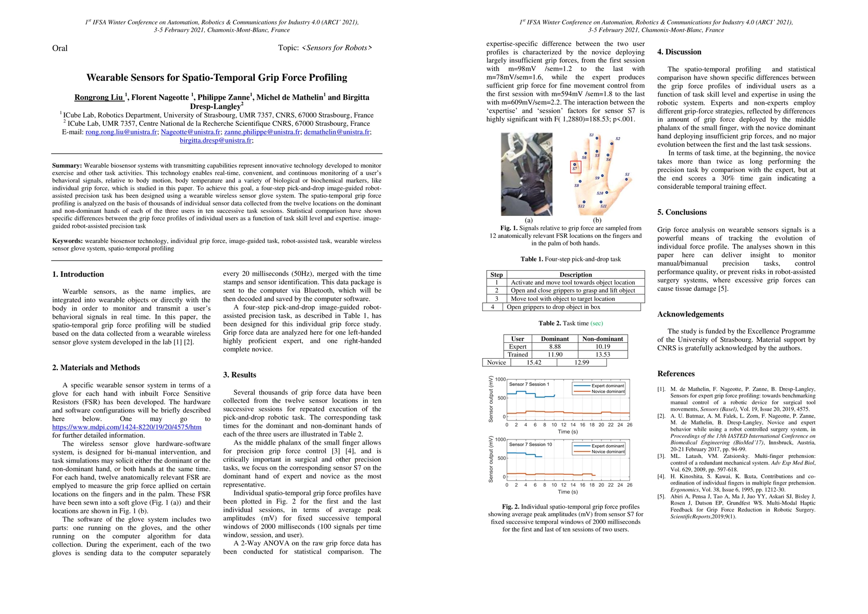 This study used wearable sensors to analyze spatio-temporal grip force profiles of three users performing a precision task, revealing differences in grip forces based on task skill level and time.