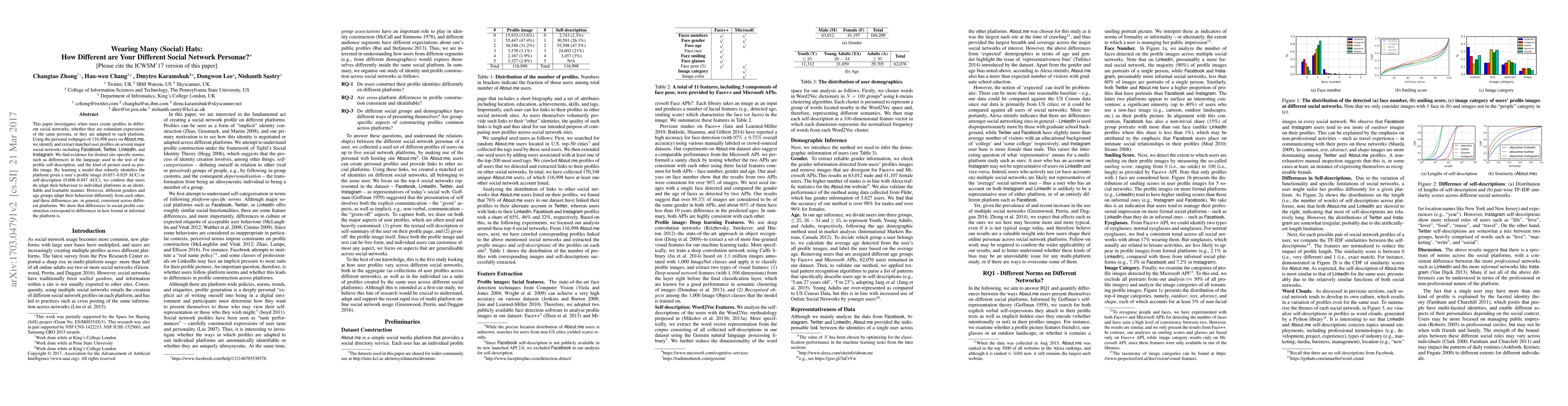 This paper investigates when users create profiles in different social networks, whether they are redundant expressions of the same persona, or they are adapted to each platform. Using the personal webpages of 116,998 users on About.me, we identify and extract matched user profiles on several major social networks including Facebook, Twitter, LinkedIn, and Instagram. We find evidence for distinct site-specific norms, such as differences in the language used in the text of the profile self-description, and the kind of picture used as profile image. By learning a model that robustly identifies the platform given a user's profile image (0.657--0.829 AUC) or self-description (0.608--0.847 AUC), we confirm that users do adapt their behaviour to individual platforms in an identifiable and learnable manner. However, different genders and age groups adapt their behaviour differently from each other, and these differences are, in general, consistent across different platforms. We show that differences in social profile construction correspond to differences in how formal or informal the platform is.