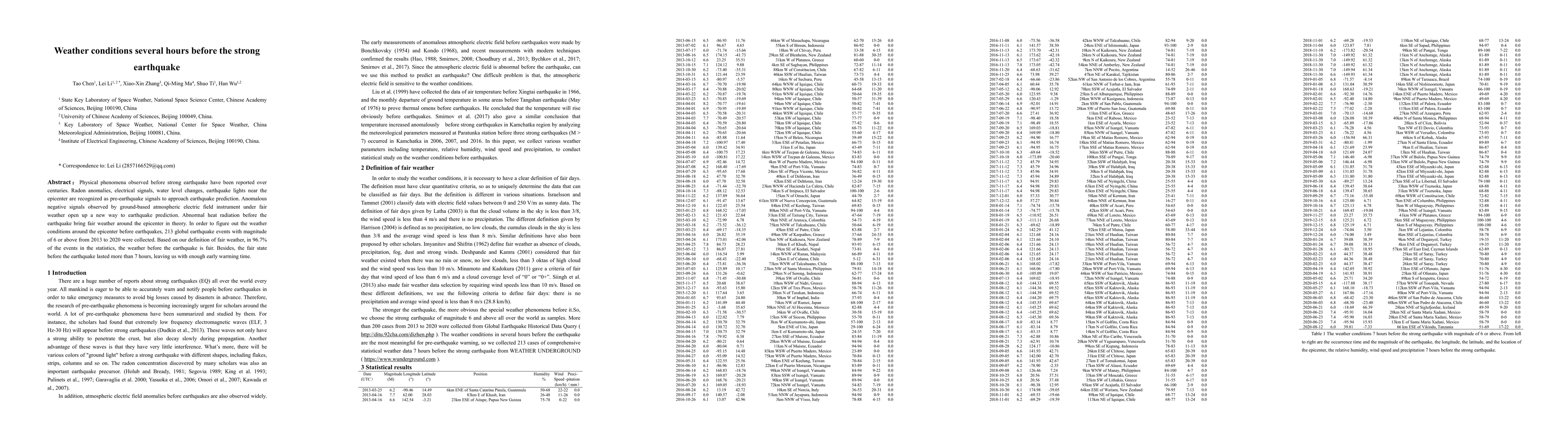 This study investigates weather conditions several hours prior to strong earthquakes, finding that 96.7% of 213 global earthquakes of magnitude 6 or above from 2013 to 2020 occurred under fair weather, lasting more than 7 hours, providing a potential early warning period.