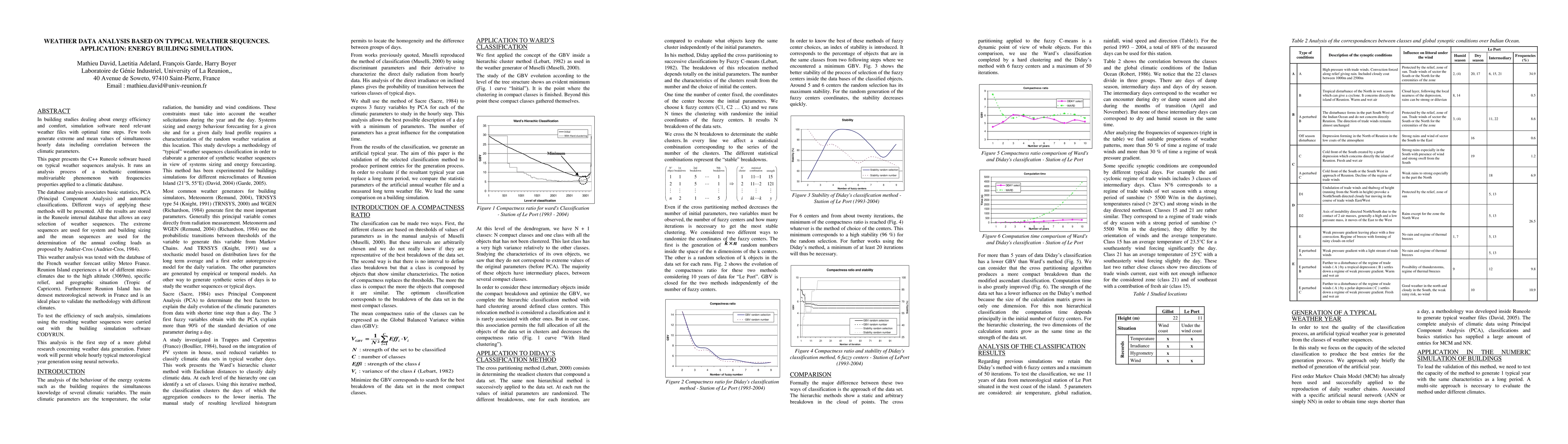 In building studies dealing about energy efficiency and comfort, simulation software need relevant weather files with optimal time steps. Few tools generate extreme and mean values of simultaneous hourly data including correlation between the climatic parameters. This paper presents the C++ Runeole software based on typical weather sequences analysis. It runs an analysis process of a stochastic continuous multivariable phenomenon with frequencies properties applied to a climatic database. The database analysis associates basic statistics, PCA (Principal Component Analysis) and automatic classifications. Different ways of applying these methods will be presented. All the results are stored in the Runeole internal database that allows an easy selection of weather sequences. The extreme sequences are used for system and building sizing and the mean sequences are used for the determination of the annual cooling loads as proposed by Audrier-Cros (Audrier-Cros, 1984). This weather analysis was tested with the database of the French weather forecast utility Meteo France. Reunion Island experiences a lot of different micro-climates due to the high altitude (3069m), specific relief, and geographic situation (Tropic of Capricorn). Furthermore Reunion Island has the densest meteorological network in France and is an ideal place to validate the methodology with different climates. To test the efficiency of such analysis, simulations using the resulting weather sequences were carried out with the building simulation software CODYRUN. This analysis is the first step of a more global research concerning weather data generation. Future work will permit whole hourly typical meteorological year generation using neural networks.