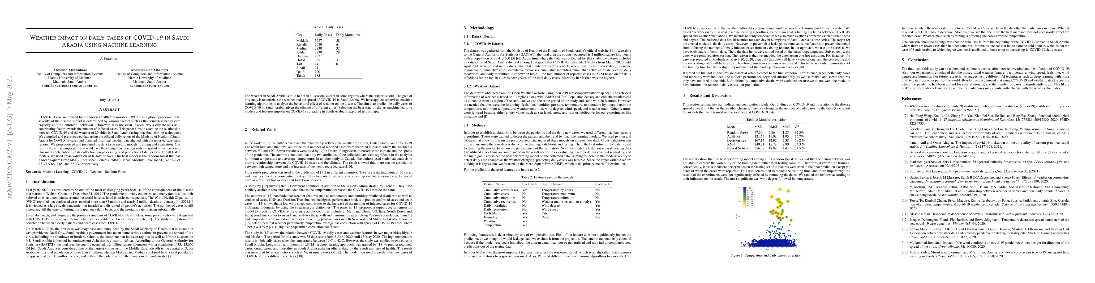 COVID-19 was announced by the World Health Organisation (WHO) as a global pandemic. The severity of the disease spread is determined by various factors such as the countries' health care capacity and the enforced lockdown. However, it is not clear if a country's climate acts as a contributing factor towards the number of infected cases. This paper aims to examine the relationship between COVID-19 and the weather of 89 cities in Saudi Arabia using machine learning techniques. We compiled and preprocessed data using the official daily report of the Ministry of Health of Saudi Arabia for COVID-19 cases and obtained historical weather data aligned with the reported case daily reports. We preprocessed and prepared the data to be used in models' training and evaluation. Our results show that temperature and wind have the strongest association with the spread of the pandemic. Our main contribution is data collection, preprocessing, and prediction of daily cases. For all tested models, we used cross-validation of K-fold of K=5. Our best model is the random forest that has a Mean Square Error(MSE), Root Mean Square (RMSE), Mean Absolute Error (MAE), and R{2} of 97.30, 9.86, 1.85, and 82.3\%, respectively.