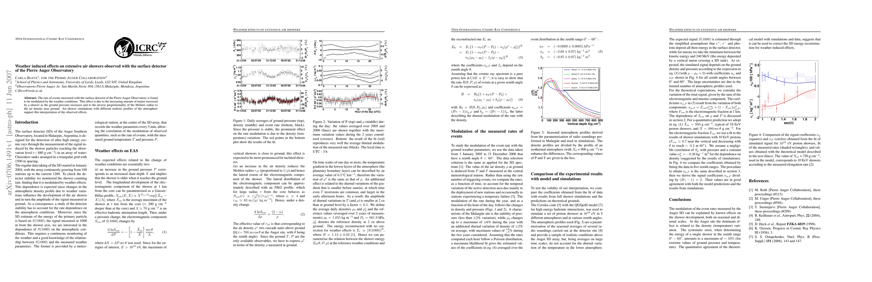 The Pierre Auger Observatory's surface detector records a weather-modulated event rate, attributed to increased ground pressure altering shower matter traversal and the Moliere radius's inverse relationship with air density. Simulation models corroborate this interpretation of weather-induced effects on extensive air showers.