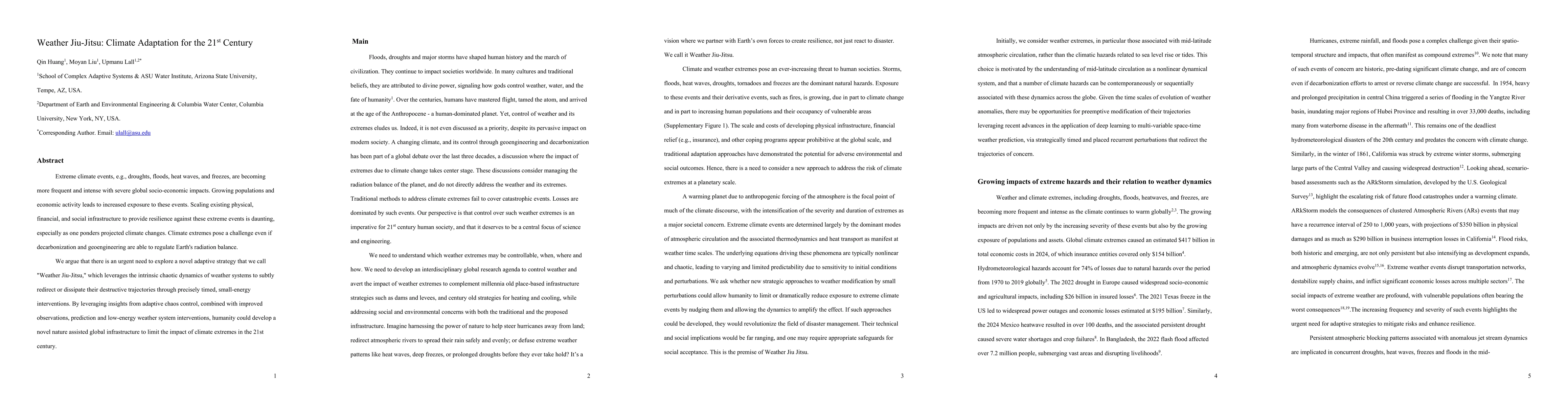 Extreme climate events, e.g., droughts, floods, heat waves, and freezes, are becoming more frequent and intense with severe global socio-economic impacts. Growing populations and economic activity leads to increased exposure to these events. Scaling existing physical, financial, and social infrastructure to provide resilience against these extreme events is daunting, especially as one ponders projected climate changes. Climate extremes pose a challenge even if decarbonization and geoengineering are able to regulate Earth's radiation balance. We argue that there is an urgent need to explore a novel adaptive strategy that we call "Weather Jiu-Jitsu," which leverages the intrinsic chaotic dynamics of weather systems to subtly redirect or dissipate their destructive trajectories through precisely timed, small-energy interventions. By leveraging insights from adaptive chaos control, combined with improved observations, prediction and low-energy weather system interventions, humanity could develop a novel nature assisted global infrastructure to limit the impact of climate extremes in the 21st century.