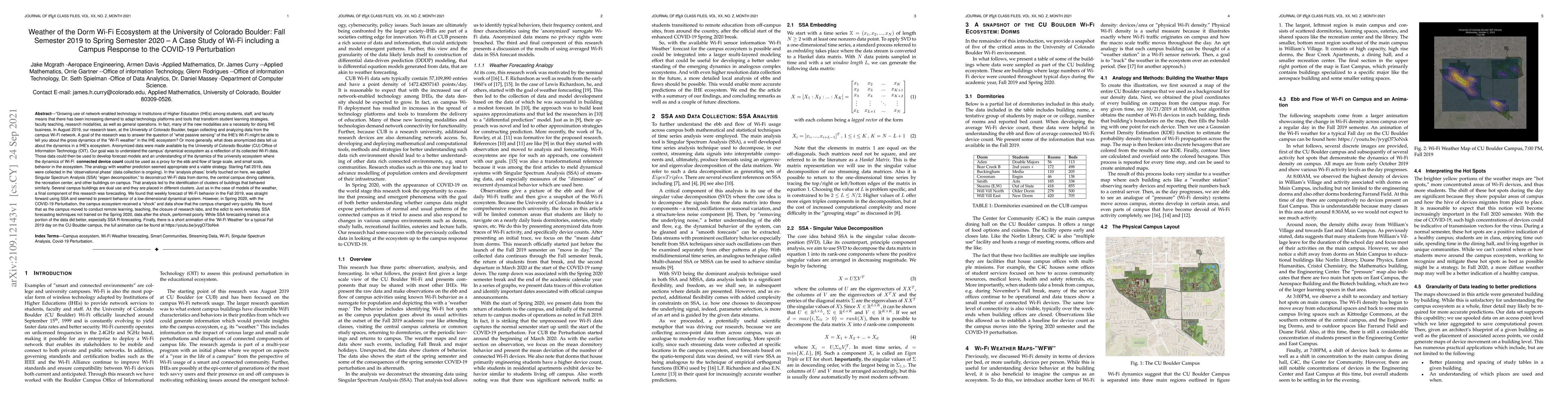 Growing use of network technology in Higher Education means that there has been increasing demand to adapt technology platforms and tools that transform student learning strategies, faculty teaching, research modalities, as well as general operations. Many of the new modalities are necessary for IHE business. In August 2019, we began collecting and analyzing data from the campus WIFI network. A goal of the research was to answer question like what passive sensing of the IHE WIFI might tell us about the dynamics of the WIFI weather in the IHE ecosystem and what does anonymized data tell us about the IHE ecosystem. The analogy with weather prediction seemed appropriate and a viable approach. Starting Fall 2019, data were collected in the observational phase. In the analysis phase, we applied Singular Spectrum Analysis decomposition, to deconstruct WIFI data from dorms, the central campus dining cafeteria, the recreation center, and other buildings on campus. That analysis led to the identification of clusters of buildings that behaved similarly. Just as in the case of models of the weather, a final component of this research was forecasting. We found that weekly forecast of WIFI behavior in the Fall 2019, were straight forward using SSA and seemed to present behavior of a low dimensional dynamical system. However, in Spring 2020, and the COVID perturbation, the campus ecosystem received a shock and data show that the campus changed very quickly. We found that as the campus moved to conduct remote learning, teaching, the closure of research labs, and the edict to work remotely, SSA forecasting techniques not trained on the Spring 2020, data after the shock, performed poorly. While SSA forecasting trained on a portion of the data did better.