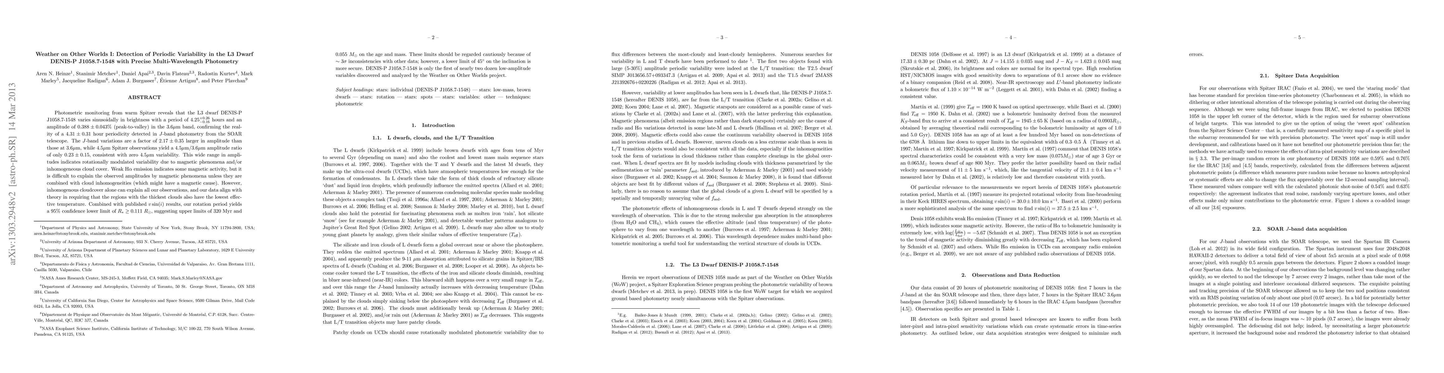 Photometric monitoring from warm Spitzer reveals that the L3 dwarf DENIS-P J1058.7-1548 varies sinusoidally in brightness with a period of 4.25 +0.26/-0.16 hours and an amplitude of 0.388 +/- 0.043% (peak-to-valley) in the 3.6 micron band, confirming the reality of a 4.31 +/- 0.31 hour periodicity detected in J-band photometry from the SOAR telescope. The J-band variations are a factor of 2.17 +/- 0.35 larger in amplitude than those at 3.6 microns, while 4.5 micron Spitzer observations yield a 4.5 micron/3.6 micron amplitude ratio of only 0.23 +/- 0.15, consistent with zero 4.5 micron variability. This wide range in amplitudes indicates rotationally modulated variability due to magnetic phenomena and/or inhomogeneous cloud cover. Weak H-alpha emission indicates some magnetic activity, but it is difficult to explain the observed amplitudes by magnetic phenomena unless they are combined with cloud inhomogeneities (which might have a magnetic cause). However, inhomogenous cloudcover alone can explain all our observations, and our data align with theory in requiring that the regions with the thickest clouds also have the lowest effective temperature. Combined with published v sin(i) results, our rotation period yields a 95% confidence lower limit of 0.111 solar radii on the radius of DENIS-P J1058.7-1548, suggesting upper limits of 320 Myr and 0.055 solar masses on the age and mass. These limits should be regarded cautiously because of 3-sigma inconsistencies with other data; however, a lower limit of 45 degrees on the inclination is more secure. DENIS-P J1058.7-1548 is only the first of nearly two dozen low-amplitude variables discovered and analyzed by the Weather on Other Worlds project.