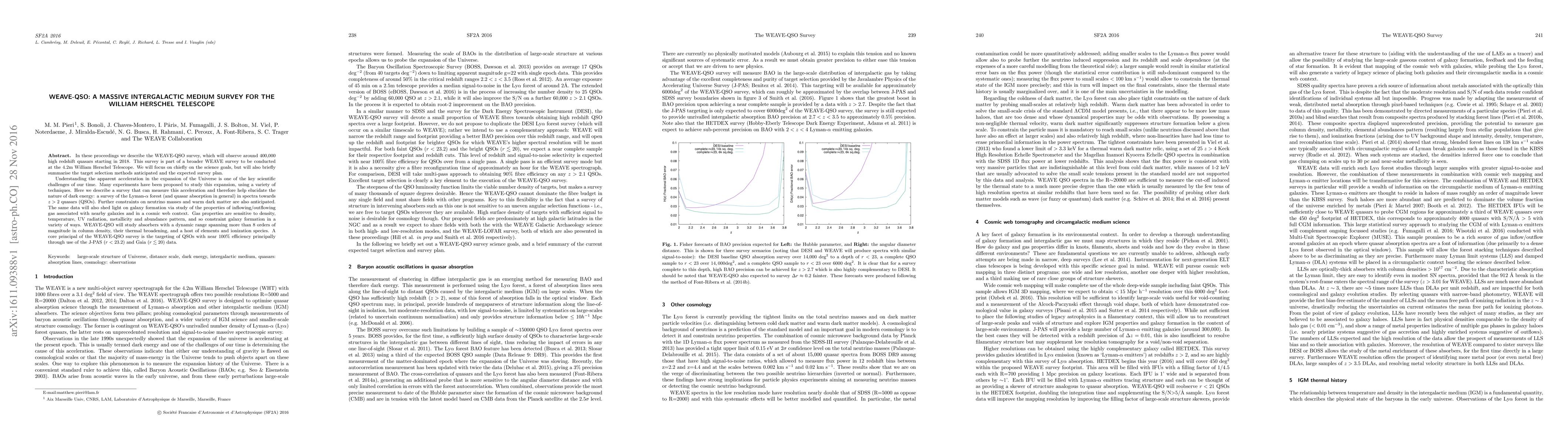 The WEAVE-QSO survey aims to observe around 400,000 high-redshift quasars to study the Lyman-alpha forest and dark energy, leveraging the William Herschel Telescope. It targets quasars with near 100% efficiency using J-PAS and Gaia data to explore the intergalactic medium and galaxy formation.