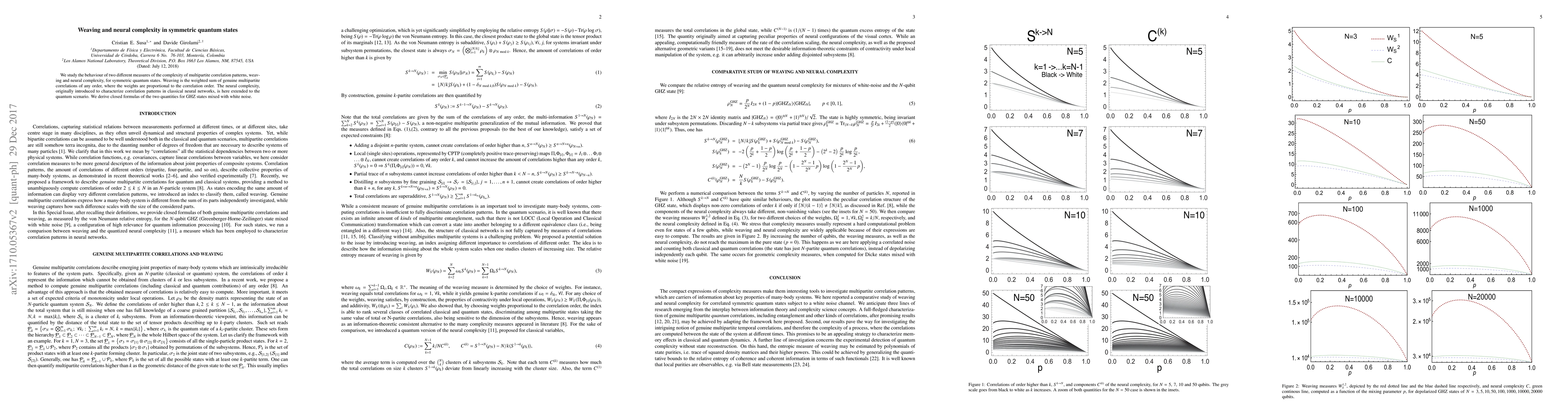 This paper explores two measures—weaving and neural complexity—of multipartite correlation patterns in symmetric quantum states, deriving closed formulas for these measures in the context of GHZ states mixed with white noise. The study extends the concept of neural complexity from classical neural networks to quantum scenarios.