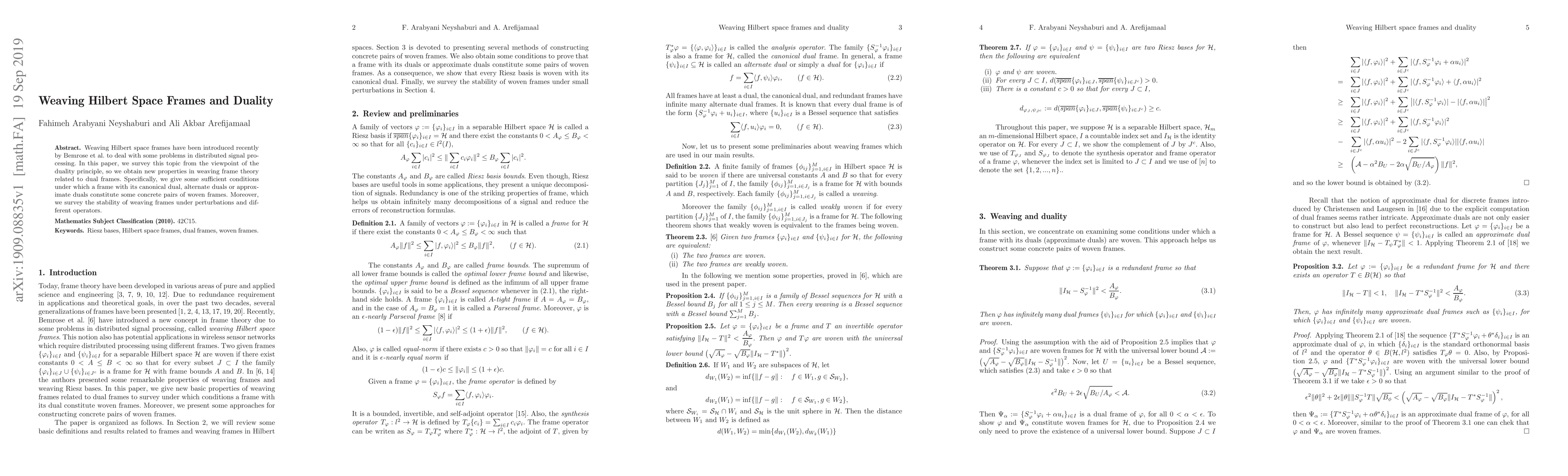 This paper surveys the concept of weaving Hilbert space frames introduced by Bemrose et al. for distributed signal processing, focusing on duality principles to derive new properties related to dual frames, including sufficient conditions for forming woven frame pairs and stability under perturbations.