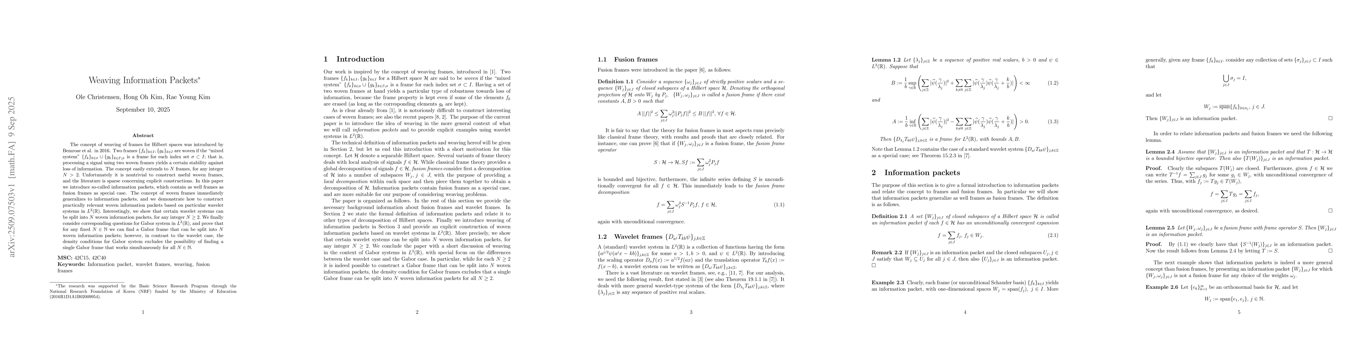 The concept of weaving of frames for Hilbert spaces was introduced by Bemrose et al. in 2016. Two frames $\{f_k\}_{k\in I}, \{g_k\}_{k\in I}$ are woven if the ``mixed system" $\{f_k\}_{k\in \sigma} \cup \{g_k\}_{k\in I\setminus \sigma}$ is a frame for each index set $\sigma \subset I;$ that is, processing a signal using two woven frames yields a certain stability against loss of information. The concept easily extends to $N$ frames, for any integer $N>2.$ Unfortunately it is nontrivial to construct useful woven frames, and the literature is sparse concerning explicit constructions. In this paper we introduce so-called information packets, which contain as well frames as fusion frames as special case. The concept of woven frames immediately generalizes to information packets, and we demonstrate how to construct practically relevant woven information packets based on particular wavelet systems in $\ltr.$ Interestingly, we show that certain wavelet systems can be split into $N$ woven information packets, for any integer $N\ge 2.$ We finally consider corresponding questions for Gabor system in $\ltr,$ and prove that for any fixed $N\in \mn$ we can find a Gabor frame that can be split into $N$ woven information packets; however, in contrast to the wavelet case, the density conditions for Gabor system excludes the possibility of finding a single Gabor frame that works simultaneously for all $N\in \mn.$