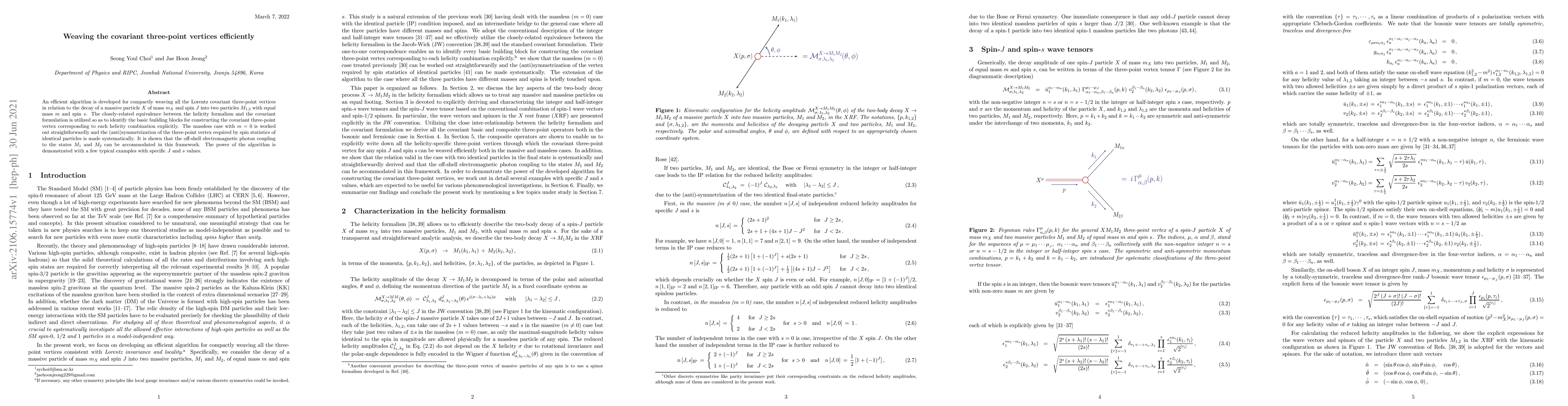 An efficient algorithm is developed for compactly weaving all the Lorentz covariant three-point vertices in relation to the decay of a massive particle $X$ of mass $m_X$ and spin $J$ into two particles $ M_{1,2}$ with equal mass $m$ and spin $s$. The closely-related equivalence between the helicity formalism and the covariant formulation is utilized so as to identify the basic building blocks for constructing the covariant three-point vertex corresponding to each helicity combination explicitly. The massless case with $m=0$ is worked out straightforwardly and the (anti)symmetrization of the three-point vertex required by spin statistics of identical particles is made systematically. It is shown that the off-shell electromagnetic photon coupling to the states $M_1$ and $M_2$ can be accommodated in this framework. The power of the algorithm is demonstrated with a few typical examples with specific $J$ and $s$ values.