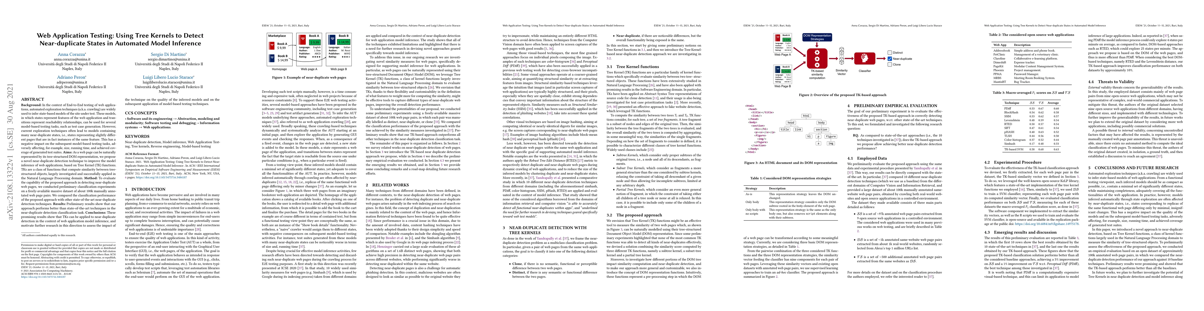 In the context of End-to-End testing of web applications, automated exploration techniques (a.k.a. crawling) are widely used to infer state-based models of the site under test. These models, in which states represent features of the web application and transitions represent reachability relationships, can be used for several model-based testing tasks, such as test case generation. However, current exploration techniques often lead to models containing many near-duplicate states, i.e., states representing slightly different pages that are in fact instances of the same feature. This has a negative impact on the subsequent model-based testing tasks, adversely affecting, for example, size, running time, and achieved coverage of generated test suites. As a web page can be naturally represented by its tree-structured DOM representation, we propose a novel near-duplicate detection technique to improve the model inference of web applications, based on Tree Kernel (TK) functions. TKs are a class of functions that compute similarity between tree-structured objects, largely investigated and successfully applied in the Natural Language Processing domain. To evaluate the capability of the proposed approach in detecting near-duplicate web pages, we conducted preliminary classification experiments on a freely-available massive dataset of about 100k manually annotated web page pairs. We compared the classification performance of the proposed approach with other state-of-the-art near-duplicate detection techniques. Preliminary results show that our approach performs better than state-of-the-art techniques in the near-duplicate detection classification task. These promising results show that TKs can be applied to near-duplicate detection in the context of web application model inference, and motivate further research in this direction.