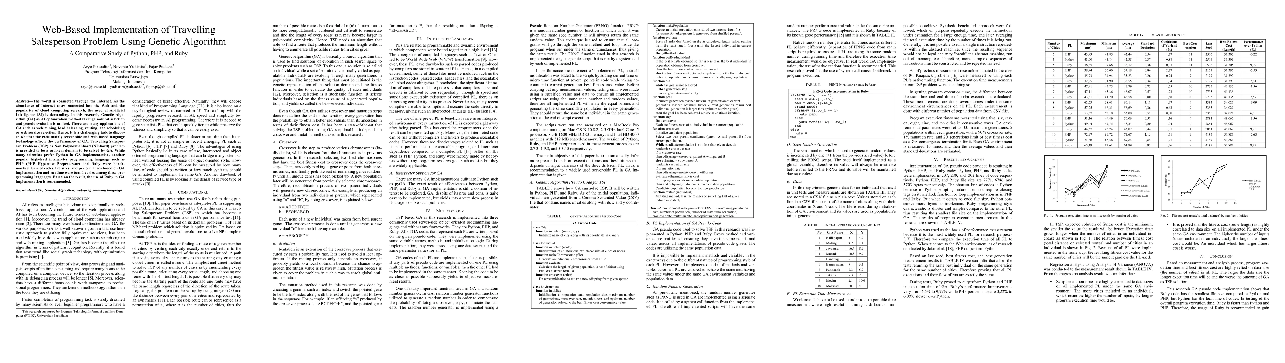 This research implemented a genetic algorithm for solving the Traveling Salesman Problem (TSP) using Python, PHP, and Ruby programming languages.