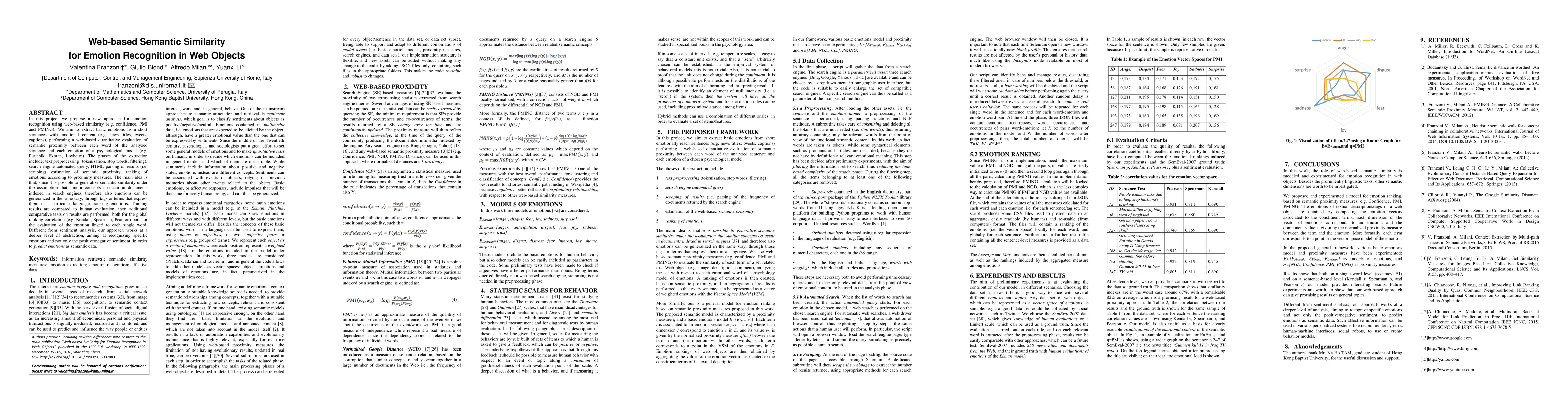 In this project we propose a new approach for emotion recognition using web-based similarity (e.g. confidence, PMI and PMING). We aim to extract basic emotions from short sentences with emotional content (e.g. news titles, tweets, captions), performing a web-based quantitative evaluation of semantic proximity between each word of the analyzed sentence and each emotion of a psychological model (e.g. Plutchik, Ekman, Lovheim). The phases of the extraction include: text preprocessing (tokenization, stop words, filtering), search engine automated query, HTML parsing of results (i.e. scraping), estimation of semantic proximity, ranking of emotions according to proximity measures. The main idea is that, since it is possible to generalize semantic similarity under the assumption that similar concepts co-occur in documents indexed in search engines, therefore also emotions can be generalized in the same way, through tags or terms that express them in a particular language, ranking emotions. Training results are compared to human evaluation, then additional comparative tests on results are performed, both for the global ranking correlation (e.g. Kendall, Spearman, Pearson) both for the evaluation of the emotion linked to each single word. Different from sentiment analysis, our approach works at a deeper level of abstraction, aiming at recognizing specific emotions and not only the positive/negative sentiment, in order to predict emotions as semantic data.