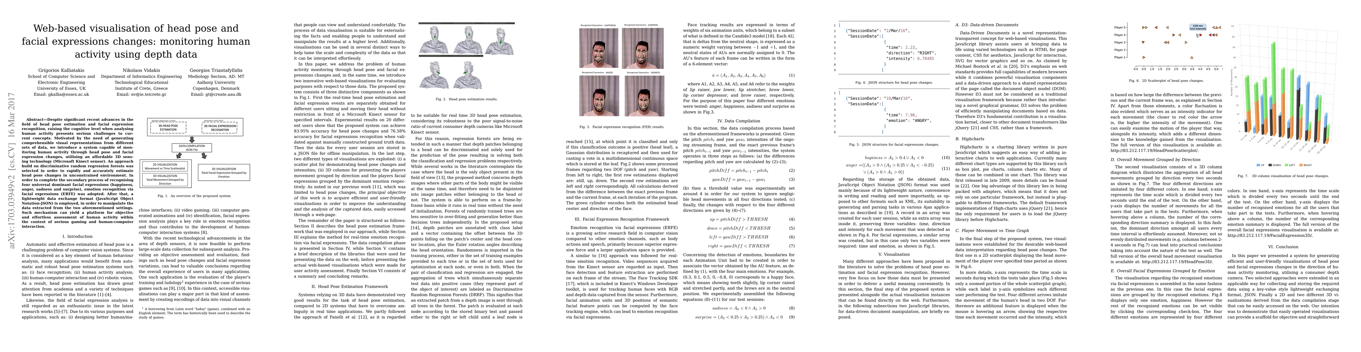 This paper presents a web-based system using a Microsoft Kinect sensor to monitor human activity through head pose and facial expressions, employing discriminative random regression forests and emotion recognition via facial expressions (ERFE) for analysis. The system facilitates objective assessment in serious gaming and human-computer interaction.