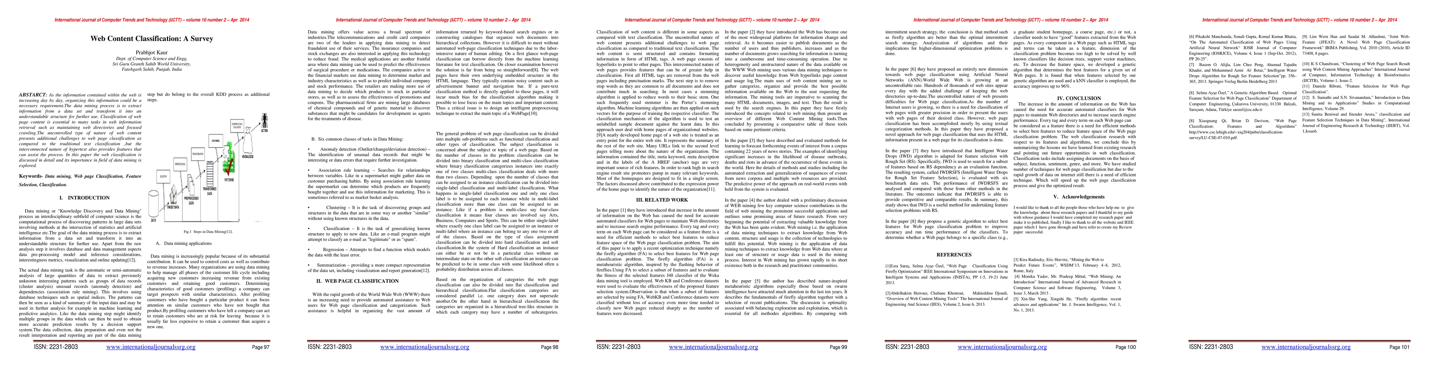 This paper surveys web content classification, emphasizing its significance in data mining for organizing the ever-growing web information. It discusses the challenges and benefits of classifying web pages, particularly in web information retrieval tasks like maintaining directories and focused crawling.
