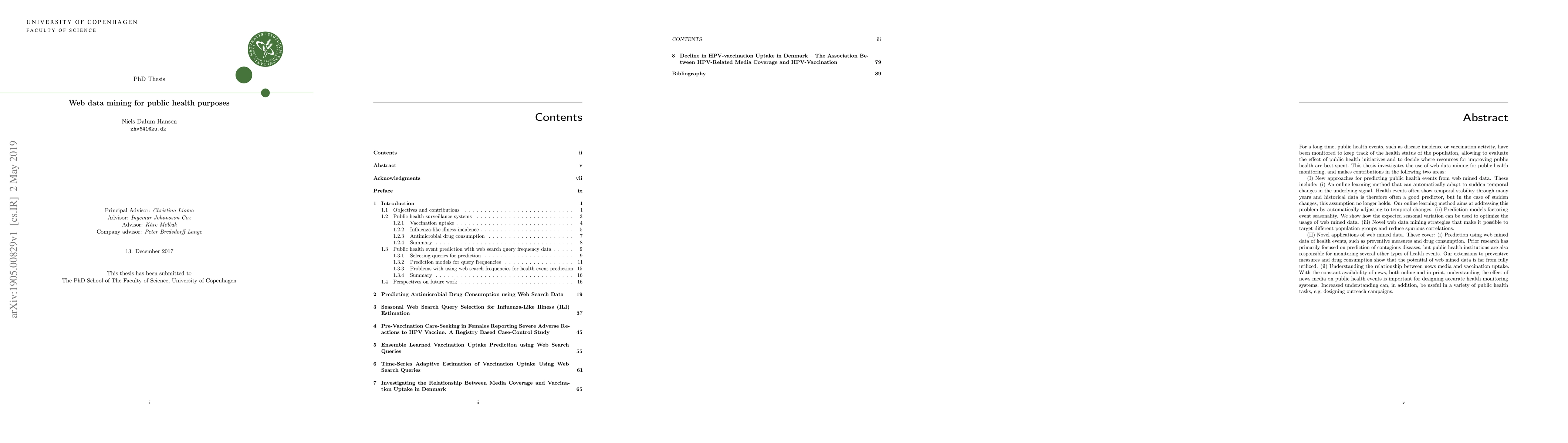For a long time, public health events, such as disease incidence or vaccination activity, have been monitored to keep track of the health status of the population, allowing to evaluate the effect of public health initiatives and to decide where resources for improving public health are best spent. This thesis investigates the use of web data mining for public health monitoring, and makes contributions in the following two areas: New approaches for predicting public health events from web mined data, and novel applications of web mined data for public health monitoring.