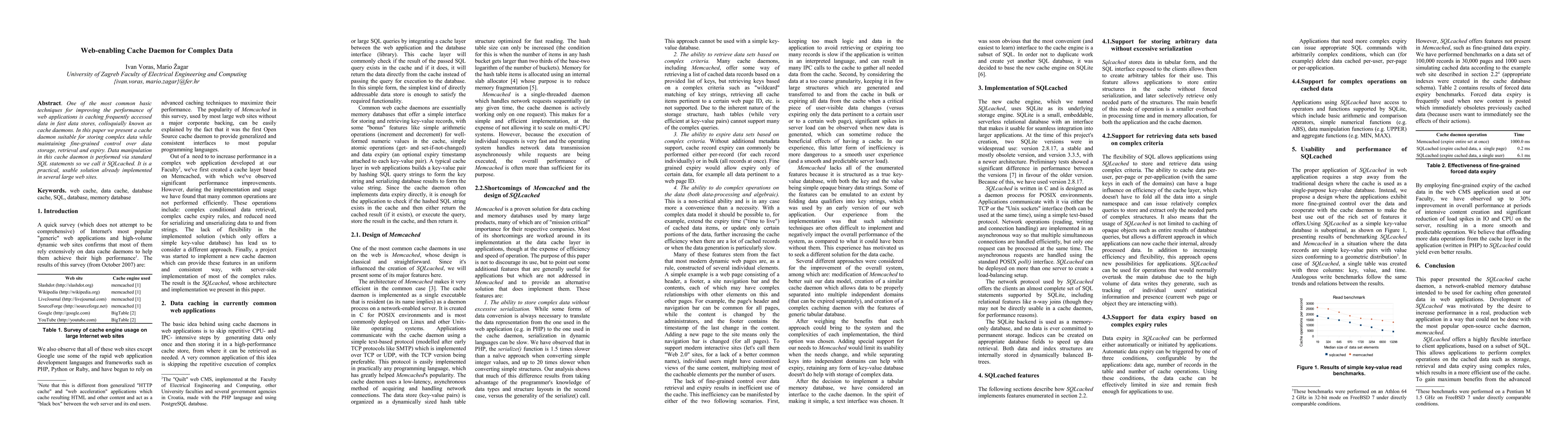 This paper introduces SQLcached, a web-enabling cache daemon for complex data, designed to improve web application performance through fine-grained control over data storage, retrieval, and expiry using standard SQL statements. It has been successfully implemented in several large web sites.
