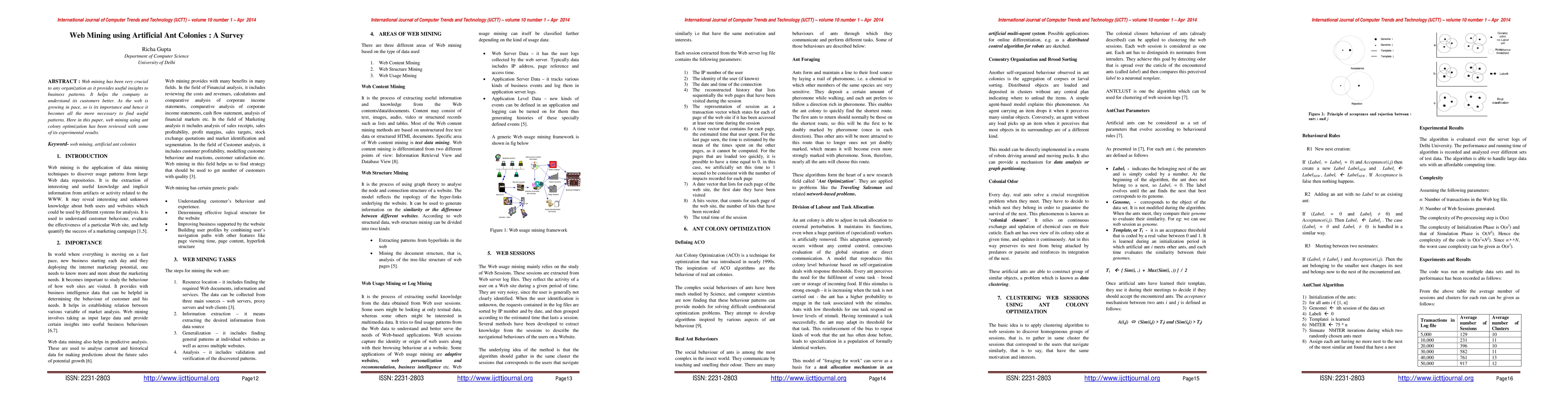 Web mining has been very crucial to any organization as it provides useful insights to business patterns. It helps the company to understand its customers better. As the web is growing in pace, so is its importance and hence it becomes all the more necessary to find useful patterns. Here in this paper, web mining using ant colony optimization has been reviewed with some of its experimental results.