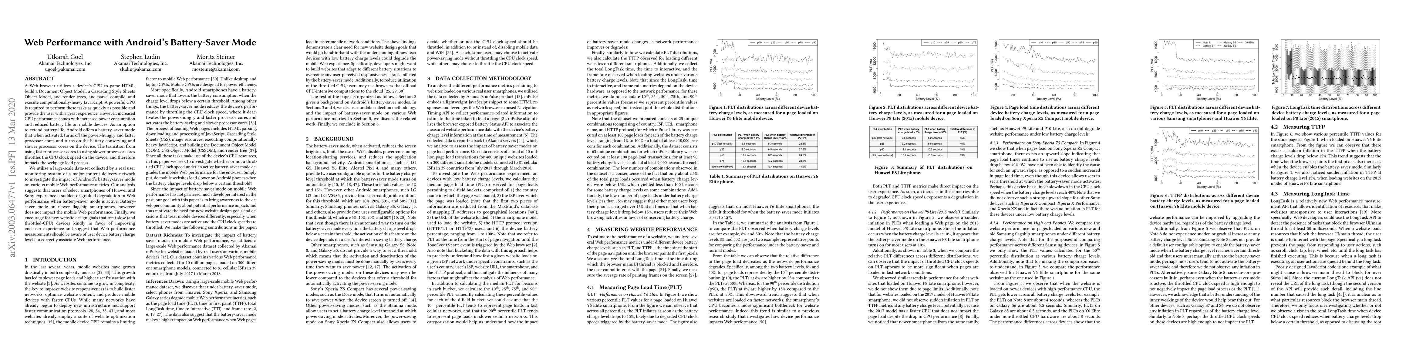 This study investigates the impact of Android's battery-saver mode on mobile web performance, finding that older smartphones from Huawei and Sony experience performance degradation, while newer flagship models are unaffected. The research recommends designing web content to accommodate slower devices and suggests performance metrics should consider battery charge levels.