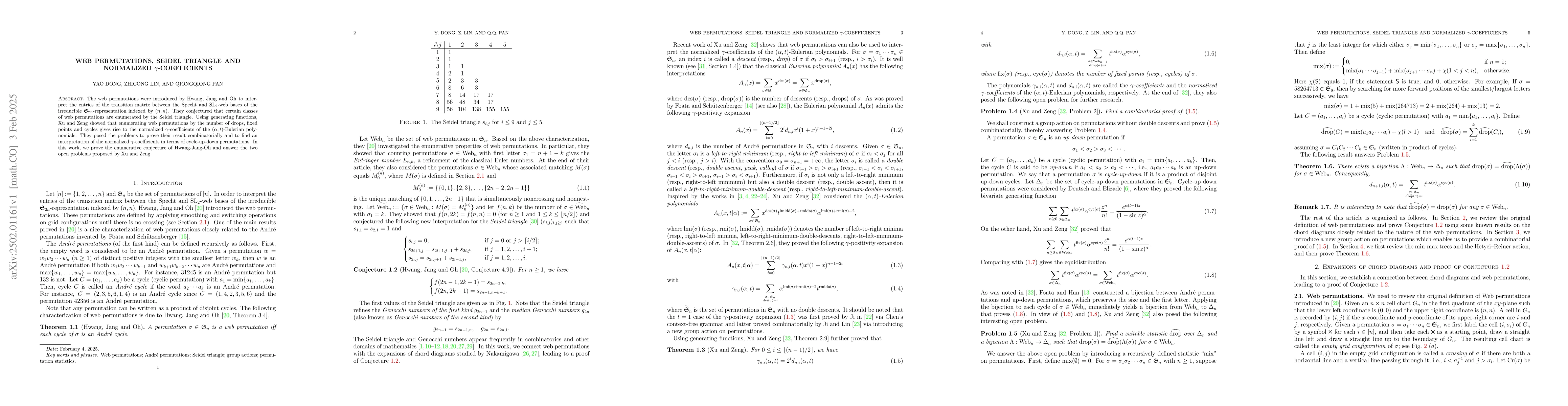 This paper proves the conjecture by Hwang, Jang, and Oh regarding the enumeration of web permutations via the Seidel triangle and addresses the open problems posed by Xu and Zeng on the combinatorial interpretation of normalized $\gamma$-coefficients in terms of cycle-up-down permutations.
