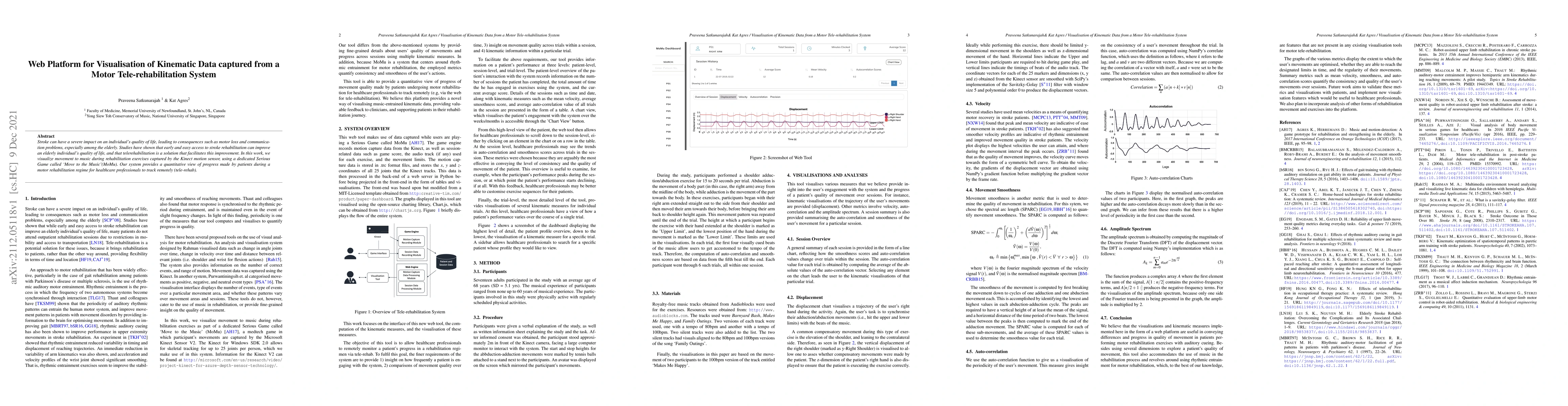 Stroke can have a severe impact on an individual's quality of life, leading to consequences such as motor loss and communication problems, especially among the elderly. Studies have shown that early and easy access to stroke rehabilitation can improve an elderly individual's quality of life, and that telerehabilitation is a solution that facilitates this improvement. In this work, we visualize movement to music during rehabilitation exercises captured by the Kinect motion sensor, using a dedicated Serious Game called `Move to the Music'(MoMu). Our system provides a quantitative view of progress made by patients during a motor rehabilitation regime for healthcare professionals to track remotely (tele-rehab).