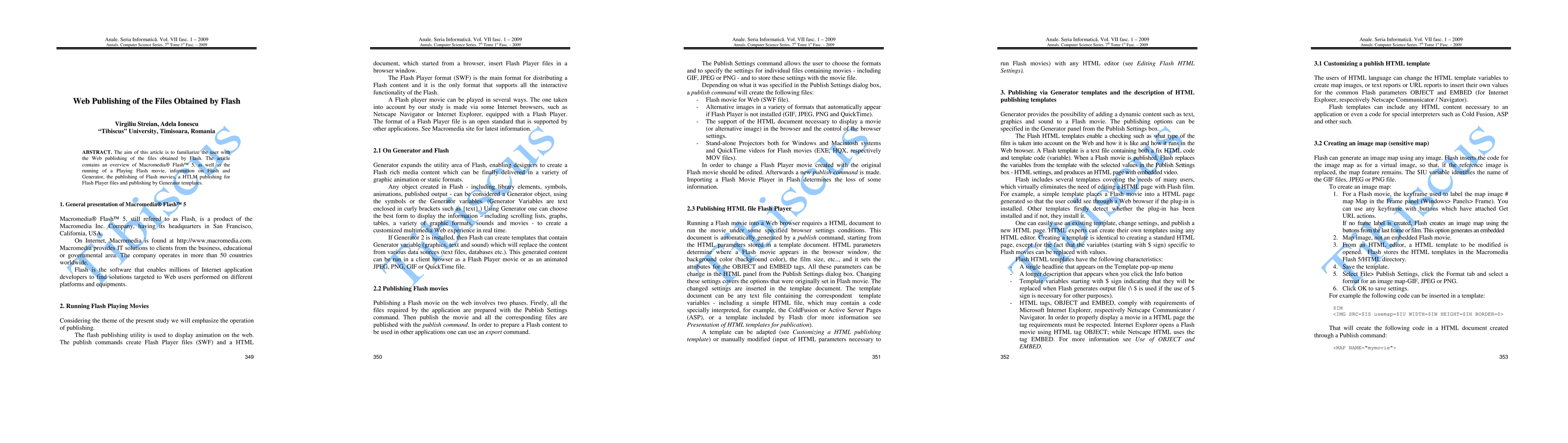 The aim of this article is to familiarize the user with the Web publishing of the files obtained by Flash. The article contains an overview of Macromedia Flash 5, as well as the running of a Playing Flash movie, information on Flash and Generator, the publishing of Flash movies, a HTLM publishing for Flash Player files and publishing by Generator templates.