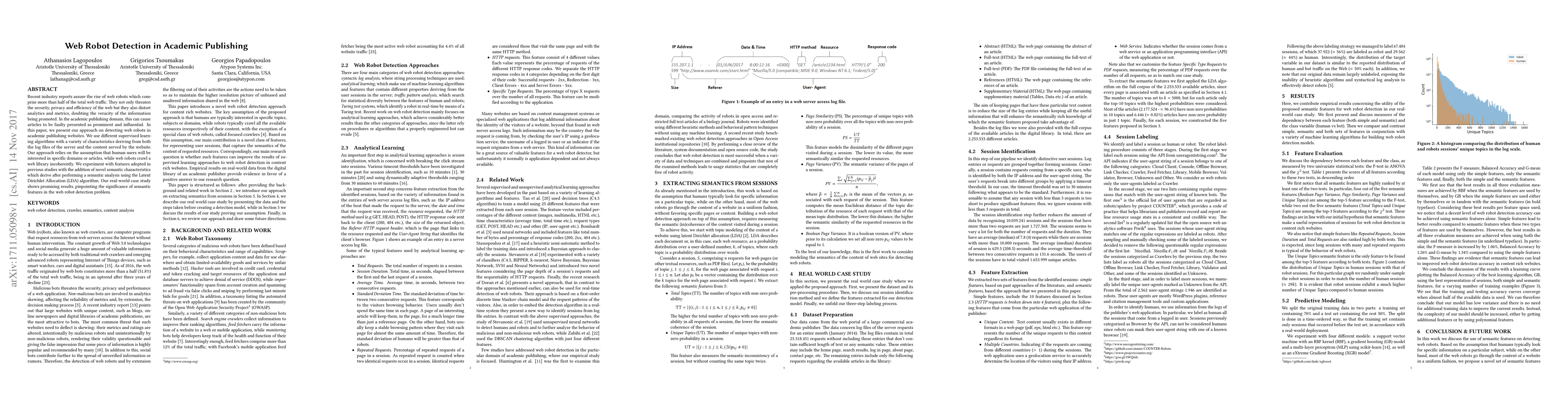 This paper proposes a method for detecting web robots in academic publishing using supervised learning algorithms. It leverages both server log data and semantic content analysis via the LDA algorithm to distinguish between human and robot traffic, showing that semantic features significantly enhance detection accuracy.