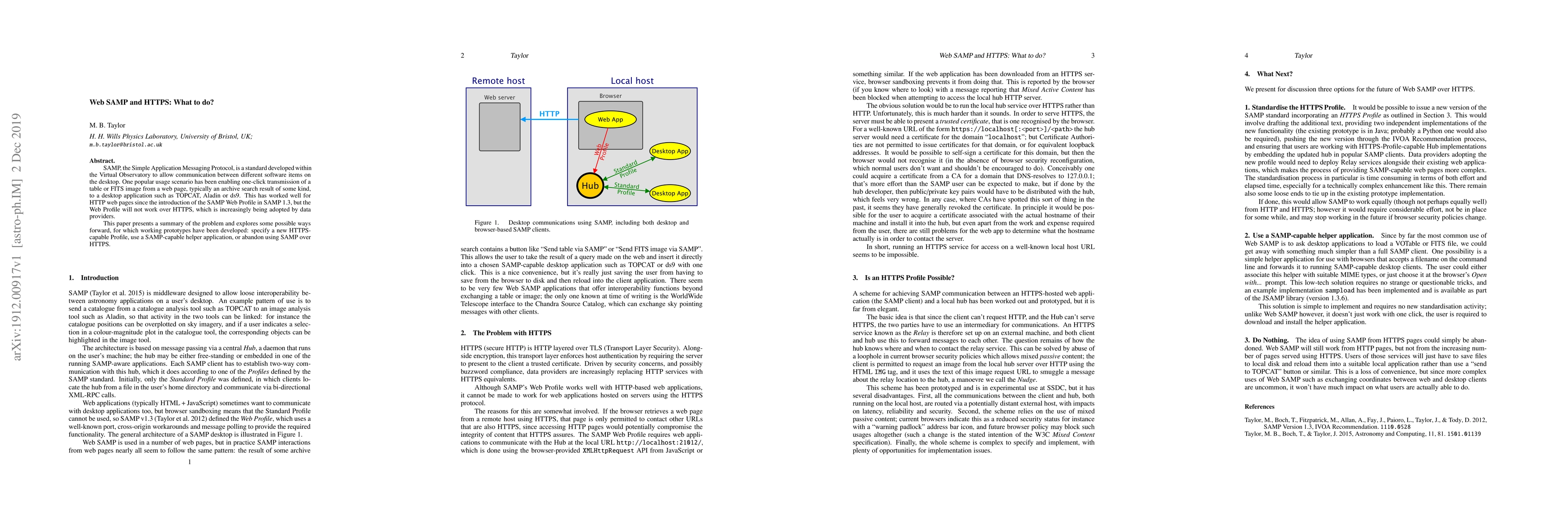 The paper discusses the incompatibility of SAMP Web Profile with HTTPS, affecting one-click data transmission from secure web pages to desktop apps. It proposes three solutions: a new HTTPS-capable Profile, a SAMP-capable helper application, or abandoning SAMP over HTTPS, presenting working prototypes for each.