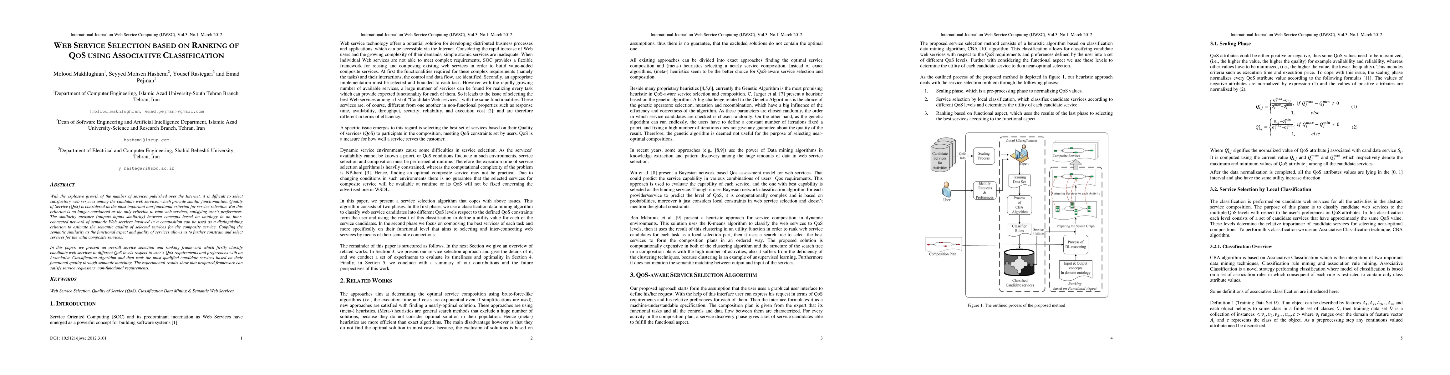 With the explosive growth of the number of services published over the Internet, it is difficult to select satisfactory web services among the candidate web services which provide similar functionalities. Quality of Service (QoS) is considered as the most important non-functional criterion for service selection. But this criterion is no longer considered as the only criterion to rank web services, satisfying user's preferences. The similarity measure (outputs-inputs similarity) between concepts based on ontology in an interconnected network of semantic Web services involved in a composition can be used as a distinguishing criterion to estimate the semantic quality of selected services for the composite service. Coupling the semantic similarity as the functional aspect and quality of services allows us to further constrain and select services for the valid composite services. In this paper, we present an overall service selection and ranking framework which firstly classify candidate web services to different QoS levels respect to user's QoS requirements and preferences with an Associative Classification algorithm and then rank the most qualified candidate services based on their functional quality through semantic matching. The experimental results show that proposed framework can satisfy service requesters' non-functional requirements.