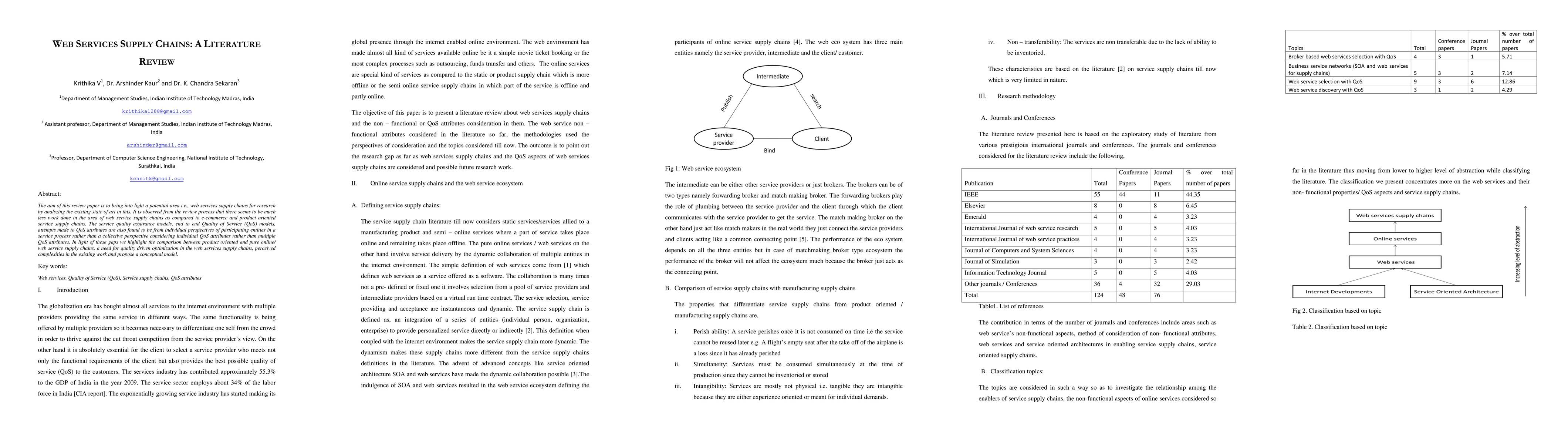 The aim of this review paper is to bring into light a potential area i.e., web services supply chains for research by analyzing the existing state of art in this. It is observed from the review process that there seems to be much less work done in the area of web service supply chains as compared to e-commerce and product oriented service supply chains. The service quality assurance models, end to end Quality of Service (QoS) models, attempts made to QoS attributes are also found to be from individual perspectives of participating entities in a service process rather than a collective perspective considering individual QoS attributes rather than multiple QoS attributes. In light of these gaps we highlight the comparison between product oriented and pure online/ web service supply chains, a need for quality driven optimization in the web services supply chains, perceived complexities in the existing work and propose a conceptual model.