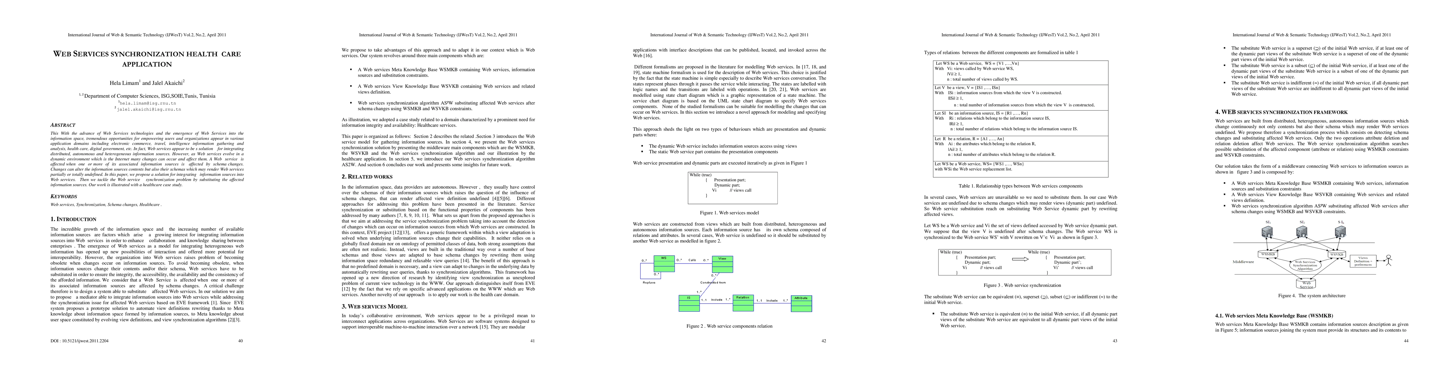 With the advance of Web Services technologies and the emergence of Web Services into the information space, tremendous opportunities for empowering users and organizations appear in various application domains including electronic commerce, travel, intelligence information gathering and analysis, health care, digital government, etc. In fact, Web services appear to be s solution for integrating distributed, autonomous and heterogeneous information sources. However, as Web services evolve in a dynamic environment which is the Internet many changes can occur and affect them. A Web service is affected when one or more of its associated information sources is affected by schema changes. Changes can alter the information sources contents but also their schemas which may render Web services partially or totally undefined. In this paper, we propose a solution for integrating information sources into Web services. Then we tackle the Web service synchronization problem by substituting the affected information sources. Our work is illustrated with a healthcare case study.