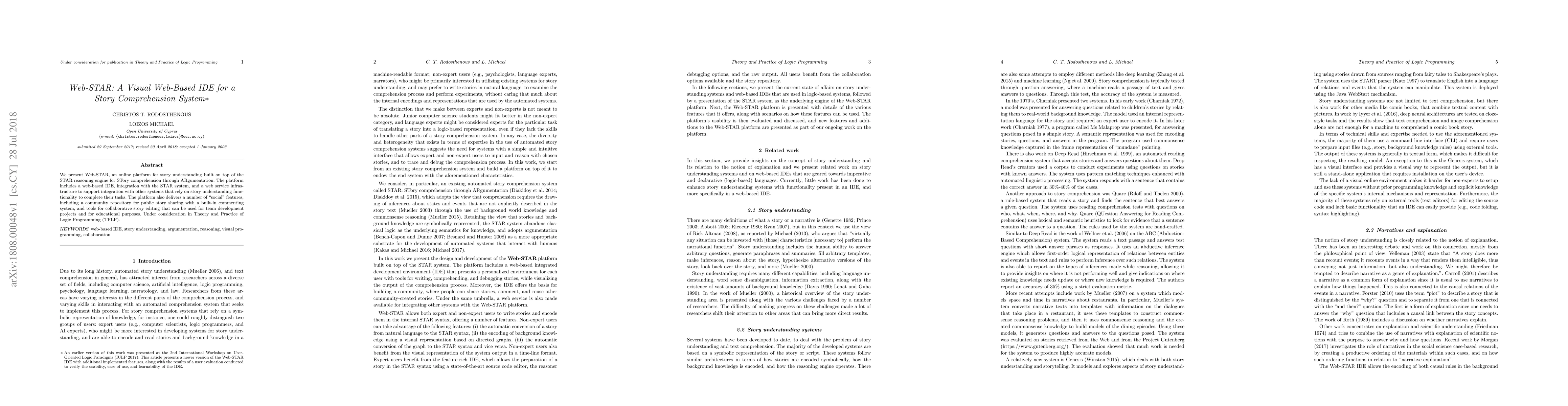 Web-STAR is an online platform featuring a web-based IDE and integration with the STAR reasoning engine for story comprehension. It includes collaborative tools and a community repository for public story sharing and editing.