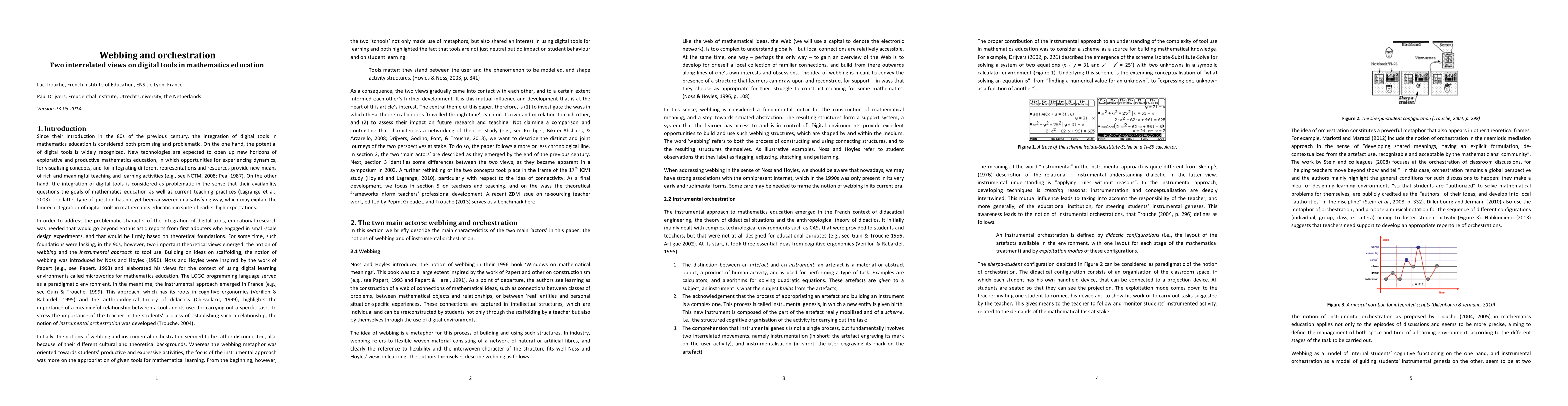 The integration of digital tools in mathematics education is considered both promising and problematic. To deal with this issue, notions of webbing and instrumental orchestration are developed. However, the two seemed to be disconnected, and having different cultural and theoretical roots. In this article, we investigate the distinct and joint journeys of these two theoretical perspectives. Taking some key moments in recent history as points of de- parture, we conclude that the two perspectives share an importance attributed to digital tools, and that initial differences, such as different views on the role of digital tools and the role of the teacher, have become more nuances. The two approaches share future chal- lenges to the organization of teachers'collaborative work and their use of digital resources.