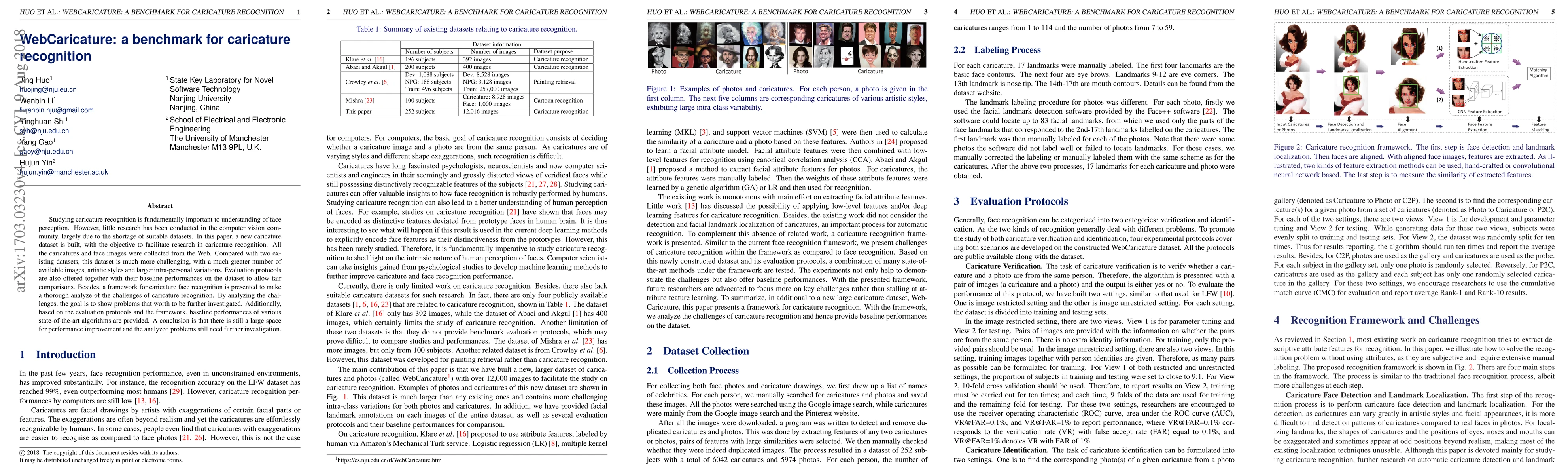 This paper introduces a new benchmark dataset, WebCaricature, for caricature recognition research, addressing the lack of suitable datasets in computer vision. The dataset features a large number of images with diverse artistic styles and significant intra-personal variations, offering rigorous evaluation protocols and baseline performances to facilitate further research and highlight areas for improvement.