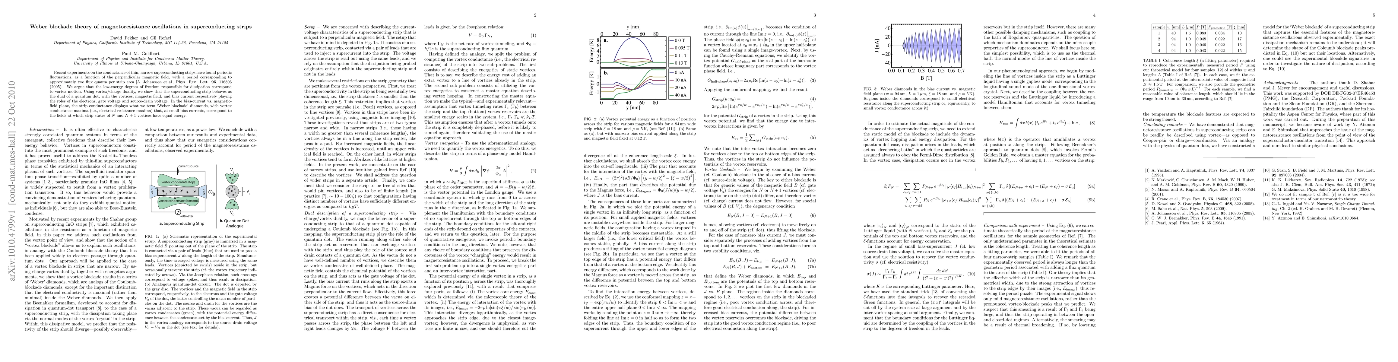 Recent experiments on the conductance of thin, narrow superconducting strips have found periodic fluctuations, as a function of the perpendicular magnetic field, with a period corresponding to approximately two flux quanta per strip area [A. Johansson et al., Phys. Rev. Lett. {\bf 95}, 116805 (2005)]. We argue that the low-energy degrees of freedom responsible for dissipation correspond to vortex motion. Using vortex/charge duality, we show that the superconducting strip behaves as the dual of a quantum dot, with the vortices, magnetic field, and bias current respectively playing the roles of the electrons, gate voltage and source-drain voltage. In the bias-current vs. magnetic-field plane, the strip conductance displays what we term `Weber blockade' diamonds, with vortex conductance maxima (i.e., electrical resistance maxima) that, at small bias-currents, correspond to the fields at which strip states of $N$ and $N+1$ vortices have equal energy.