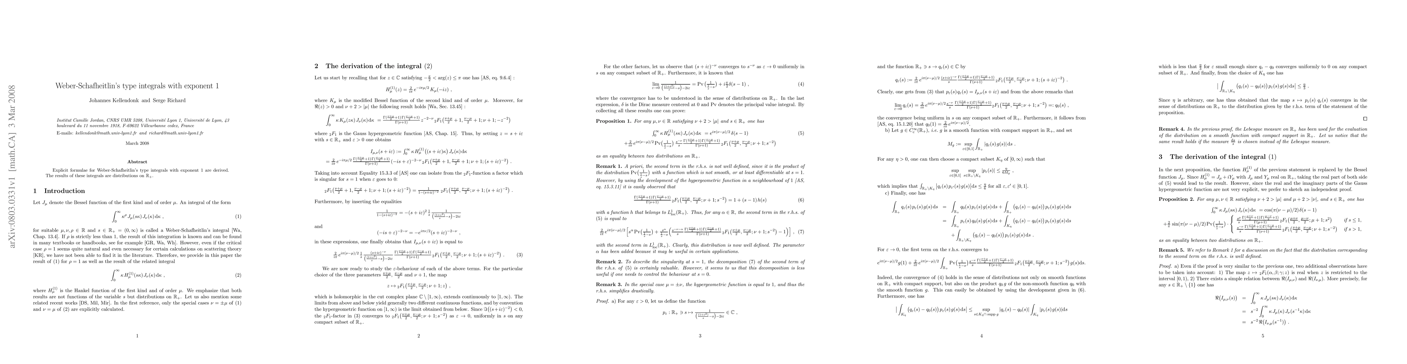 This paper presents explicit formulae for Weber-Schafheitlin's type integrals with exponent 1, revealing that their results are distributions on the positive real numbers (R_+).