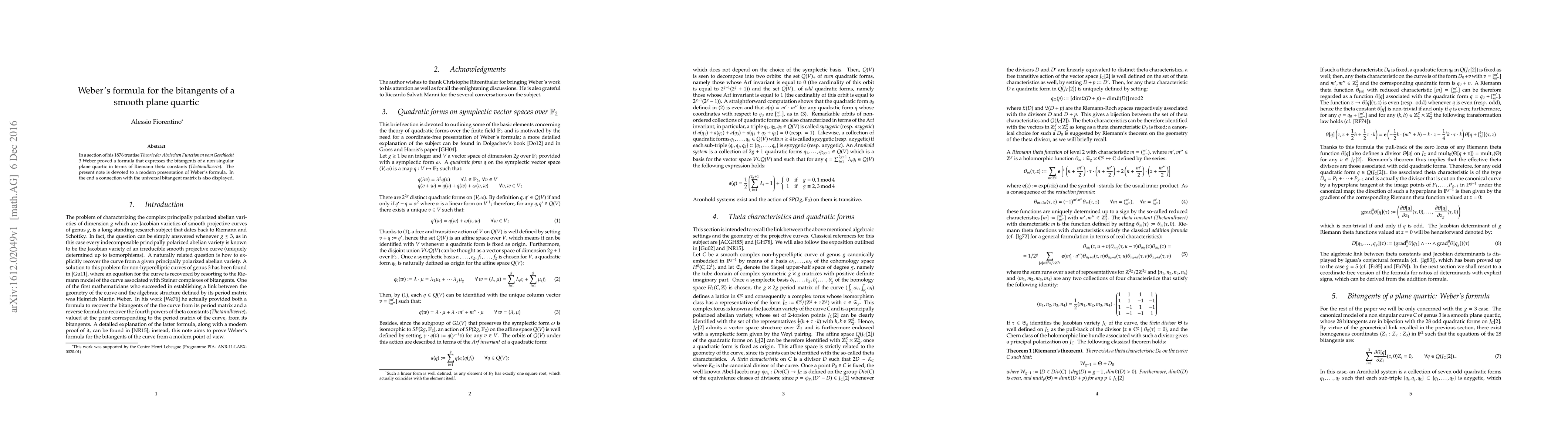 This research paper presents a modern presentation of Weber's formula for expressing bitangents of a smooth plane quartic in terms of Riemann theta constants, with implications for the universal bitangent matrix.