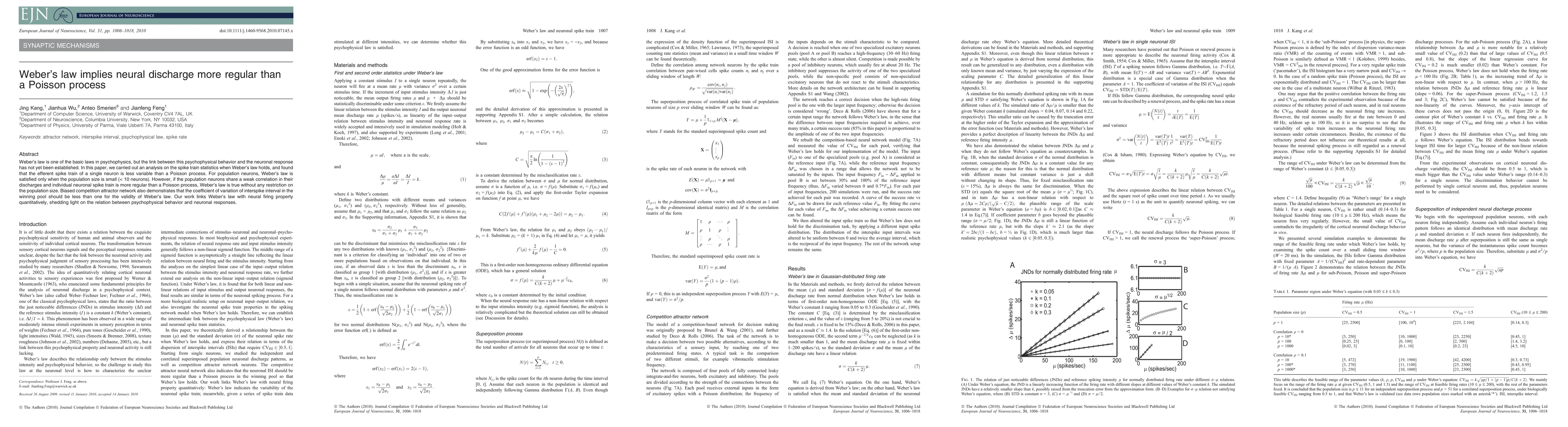 This paper demonstrates that Weber's law, a fundamental psychophysical principle, correlates with neural discharge patterns that are less variable than a Poisson process. It finds that a small population of neurons or weakly correlated neurons with regular spike trains can satisfy Weber's law regardless of population size.